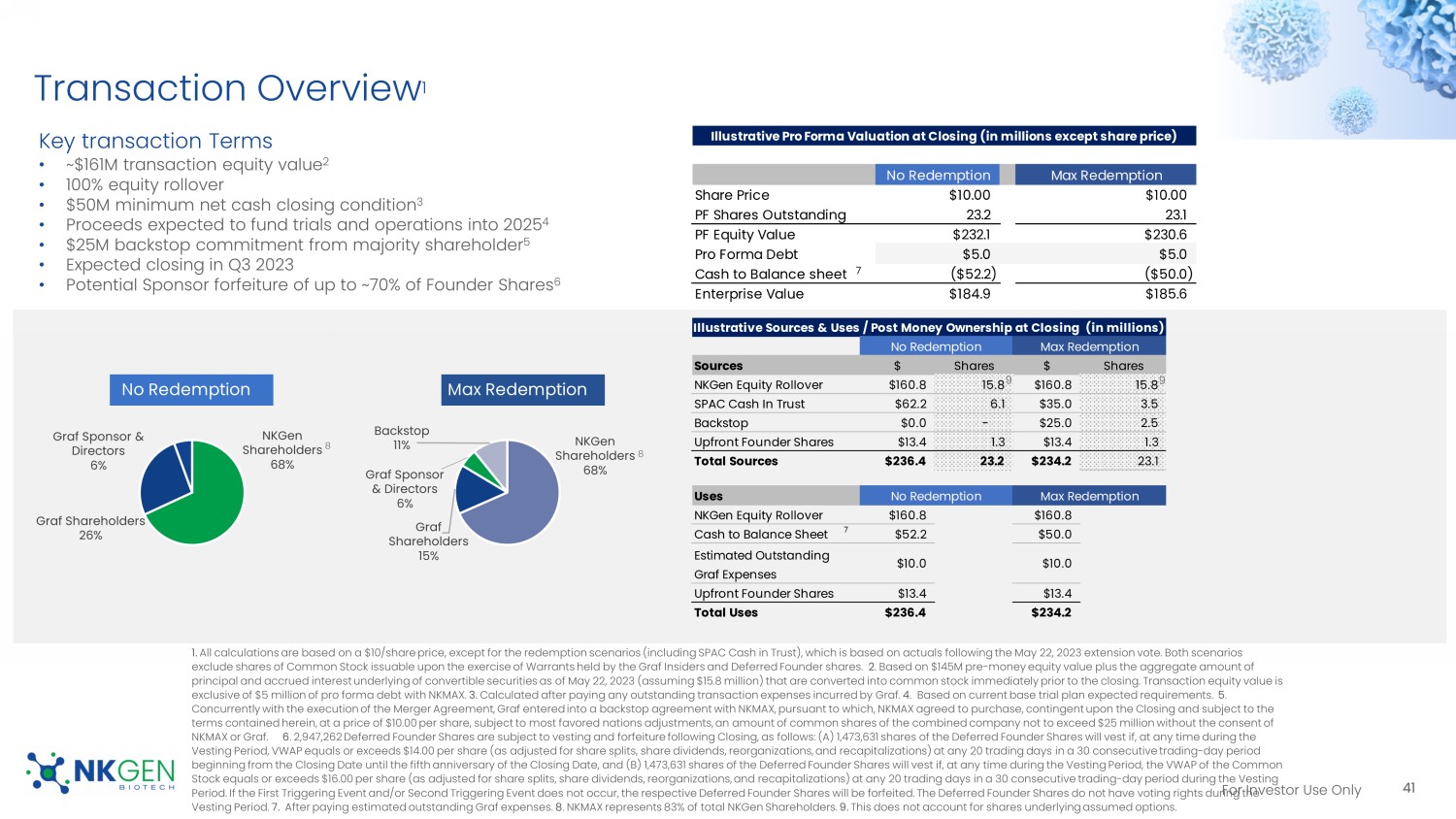 For Investor Use Only Transaction Overview 1 Key transaction Terms • ~$161M transaction equity value 2 • 100% equity rollover • $50M minimum net cash closing condition 3 • Proceeds expected to fund trials and operations into 2025 4 • $25M backstop commitment from majority shareholder 5 • Expected closing in Q3 2023 • Potential Sponsor forfeiture of up to ~70% of Founder Shares 6 41 NKGen Shareholders 68% Graf Shareholders 15% Graf Sponsor & Directors 6% Backstop 11% NKGen Shareholders 68% Graf Shareholders 26% Graf Sponsor & Directors 6% 1. All calculations are based on a $10/share price, except for the redemption scenarios (including SPAC Cash in Trust), which is ba sed on actuals following the May 22, 2023 extension vote. Both scenarios exclude shares of Common Stock issuable upon the exercise of Warrants held by the Graf Insiders and Deferred Founder shares. 2 . Based on $145M pre - money equity value plus the aggregate amount of principal and accrued interest underlying of convertible securities as of May 22, 2023 ( assuming $15.8 million) that are converted into common stock immediately prior to the closing. Transaction equity value is exclusive of $5 million of pro forma debt with NKMAX. 3. Calculated after paying any outstanding transaction expenses incurred by Graf. 4 . Based on current base trial plan expected requirements. 5 . Concurrently with the execution of the Merger Agreement, Graf entered into a backstop agreement with NKMAX, pursuant to which , N KMAX agreed to purchase, contingent upon the Closing and subject to the terms contained herein, at a price of $10.00 per share, subject to most favored nations adjustments, an amount of common shar es of the combined company not to exceed $25 million without the consent of NKMAX or Graf. 6 . 2,947,262 Deferred Founder Shares are subject to vesting and forfeiture following Closing, as follows: (A) 1,473,631 shares of the Deferred Founder Shares will vest if, at any time during the Vesting Period, VWAP equals or exceeds $14.00 per share (as adjusted for share splits, share dividends, reorganizations, and rec apitalizations) at any 20 trading days in a 30 consecutive trading - day period beginning from the Closing Date until the fifth anniversary of the Closing Date, and (B) 1,473,631 shares of the Deferred Fou nde r Shares will vest if, at any time during the Vesting Period, the VWAP of the Common Stock equals or exceeds $16.00 per share (as adjusted for share splits, share dividends, reorganizations, and recapitalizatio ns) at any 20 trading days in a 30 consecutive trading - day period during the Vesting Period. If the First Triggering Event and/or Second Triggering Event does not occur, the respective Deferred Founder Shares w ill be forfeited. The Deferred Founder Shares do not have voting rights during the Vesting Period. 7. After paying estimated outstanding Graf expenses. 8 . NKMAX represents 83% of total NKGen Shareholders. 9. This does not account for shares underlying assumed options. No Redemption Max Redemption 8 8 9 9