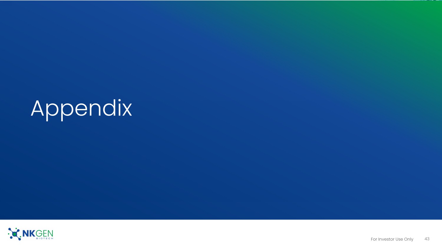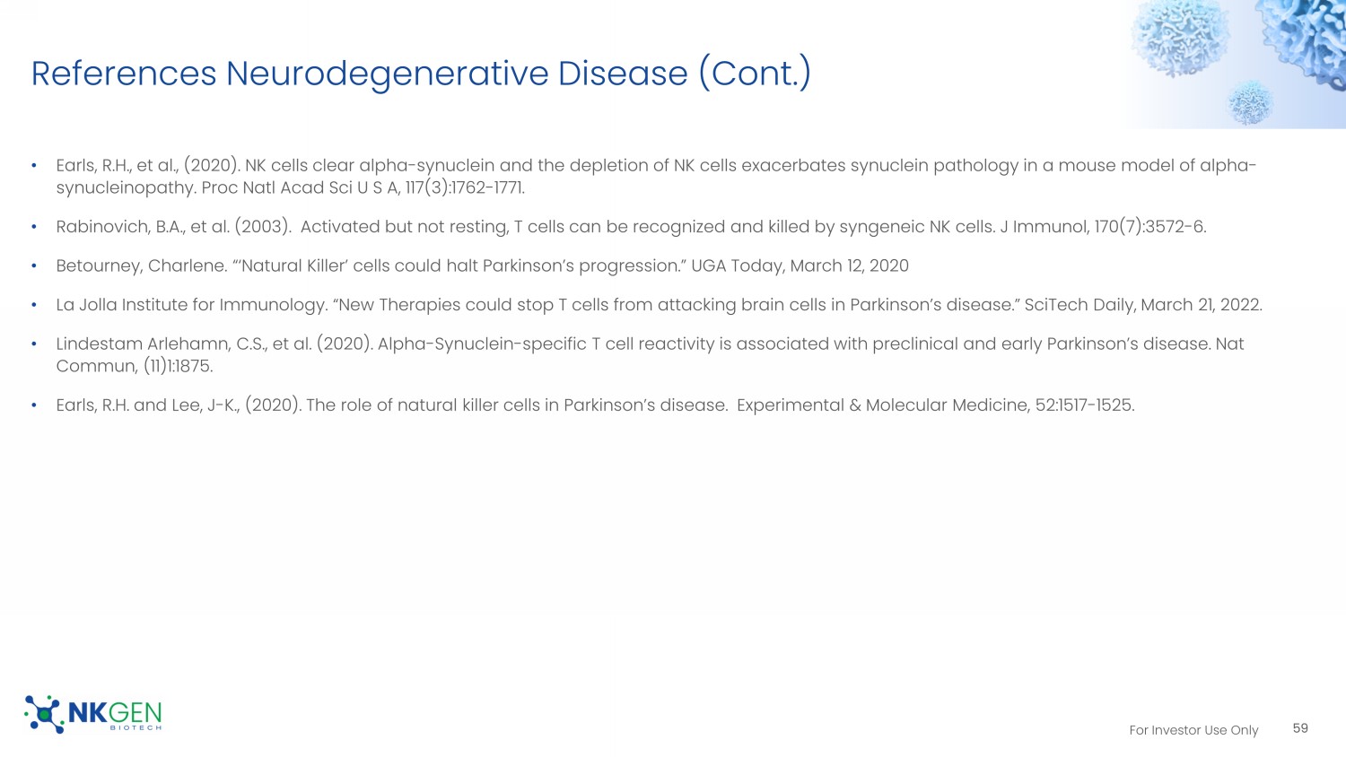 For Investor Use Only References Neurodegenerative Disease (Cont.) • Earls, R.H., et al., (2020). NK cells clear alpha - synuclein and the depletion of NK cells exacerbates synuclein pathology in a m ouse model of alpha - synucleinopathy . Proc Natl Acad Sci U S A, 117(3):1762 - 1771. • Rabinovich , B.A., et al. (2003). Activated but not resting, T cells can be recognized and killed by syngeneic NK cells. J Immunol, 170 (7) :3572 - 6. • Betourney , Charlene. “‘Natural Killer’ cells could halt Parkinson’s progression.” UGA Today, March 12, 2020 • La Jolla Institute for Immunology. “New Therapies could stop T cells from attacking brain cells in Parkinson’s disease.” SciT ech Daily, March 21, 2022. • Lindestam Arlehamn , C.S., et al. (2020). Alpha - Synuclein - specific T cell reactivity is associated with preclinical and early Parkinson’s disease. Nat Commun , (11)1:1875. • Earls, R.H. and Lee, J - K., (2020). The role of natural killer cells in Parkinson’s disease. Experimental & Molecular Medicine, 52:1517 - 1525. 59