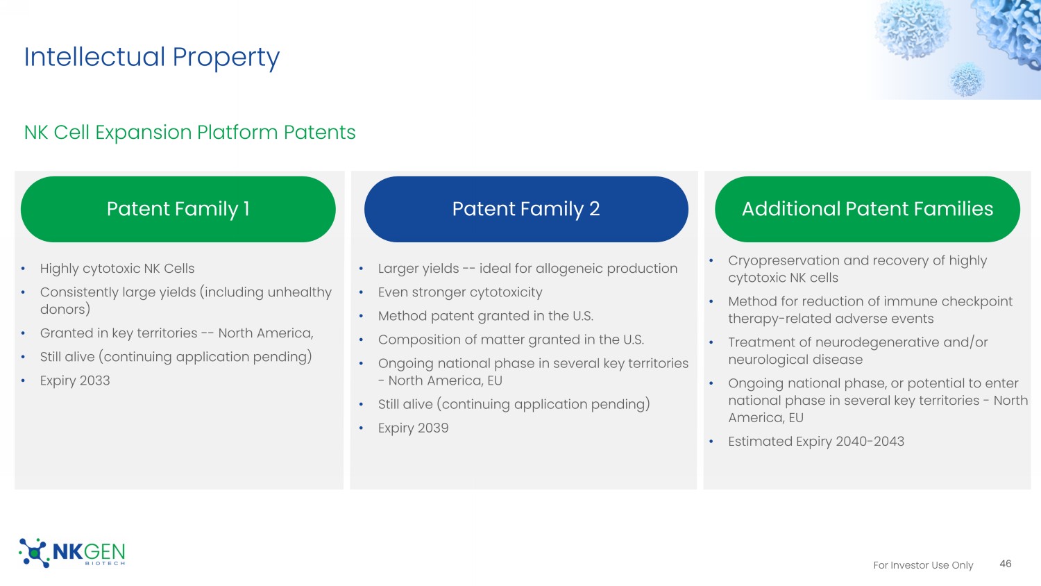 For Investor Use Only Intellectual Property NK Cell Expansion Platform Patents 46 • Highly cytotoxic NK Cells • Consistently large yields (including unhealthy donors) • Granted in key territories -- North America, • Still alive (continuing application pending) • Expiry 2033 • Larger yields -- ideal for allogeneic production • Even stronger cytotoxicity • Method patent granted in the U.S. • Composition of matter granted in the U.S. • Ongoing national phase in several key territories - North America, EU • Still alive (continuing application pending) • Expiry 2039 Patent Family 1 Patent Family 2 Additional Patent Families • Cryopreservation and recovery of highly cytotoxic NK cells • Method for reduction of immune checkpoint therapy - related adverse events • Treatment of neurodegenerative and/or neurological disease • Ongoing national phase, or potential to enter national phase in several key territories - North America, EU • Estimated Expiry 2040 - 2043