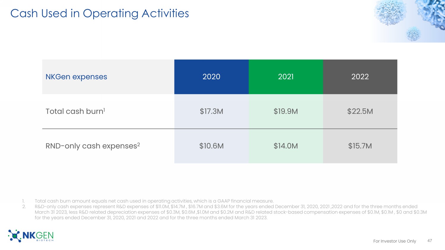 For Investor Use Only Cash Used in Operating Activities 47 NKGen expenses 2020 2021 2022 Total cash burn 1 $17.3M $19.9M $22.5M RND - only cash expenses 2 $10.6M $14.0M $15.7M 1. Total cash burn amount equals net cash used in operating activities, which is a GAAP financial measure. 2. R&D - only cash expenses represent R&D expenses of $11.0M, $14.7M , $16.7M and $3.6M for the years ended December 31, 2020, 2021 , 2022 and for the three months ended March 31 2023, less R&D related depreciation expenses of $0.3M, $0.6M ,$1.0M and $0.2M and R&D related stock - based compensation expenses of $0.1M, $0.1M , $0 and $0.3M for the years ended December 31, 2020, 2021 and 2022 and for the three months ended March 31 2023.