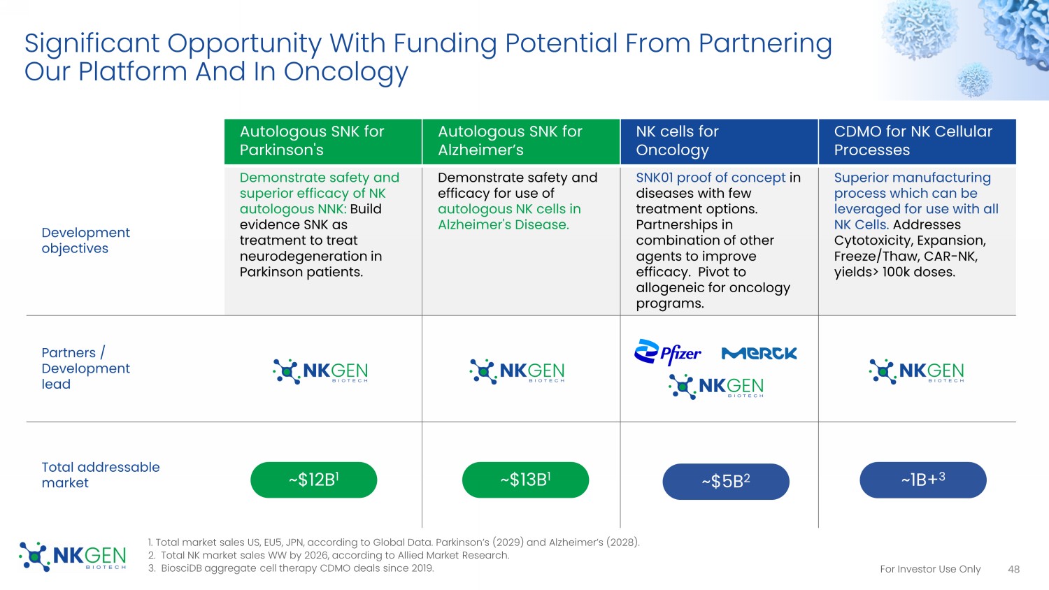 For Investor Use Only Significant Opportunity With Funding Potential From Partnering Our Platform And In Oncology 48 1. Total market sales US, EU5, JPN, according to Global Data. Parkinson’s (2029) and Alzheimer’s (2028). 2. Total NK market sales WW by 2026, according to Allied Market Research. 3. BiosciDB aggregate cell therapy CDMO deals since 2019. Autologous SNK for Parkinson's Autologous SNK for Alzheimer’s NK cells for Oncology CDMO for NK Cellular Processes Development objectives Demonstrate safety and superior efficacy of NK autologous NNK: Build evidence SNK as treatment to treat neurodegeneration in Parkinson patients. Demonstrate safety and efficacy for use of autologous NK cells in Alzheimer's Disease. SNK01 proof of concept in diseases with few treatment options. Partnerships in combination of other agents to improve efficacy. Pivot to allogeneic for oncology programs. Superior manufacturing process which can be leveraged for use with all NK Cells. Addresses Cytotoxicity, Expansion, Freeze/Thaw, CAR - NK, yields> 100k doses. Partners / Development lead Total addressable market ~$5B 2 ~1B+ 3 ~$12B 1 ~$13B 1
