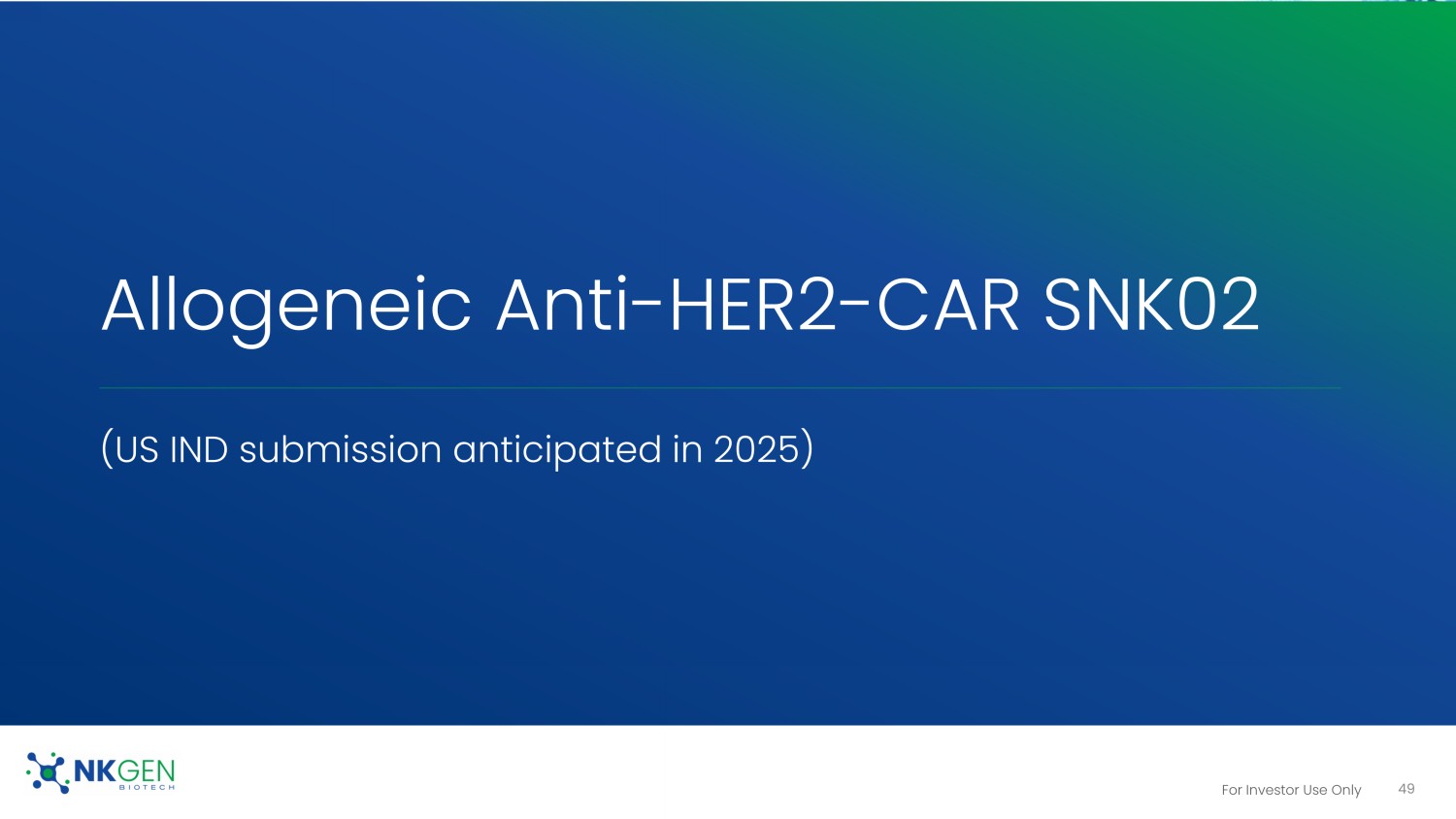 For Investor Use Only Allogeneic Anti - HER2 - CAR SNK02 49 (US IND submission anticipated in 2025) CONFIDENTIAL