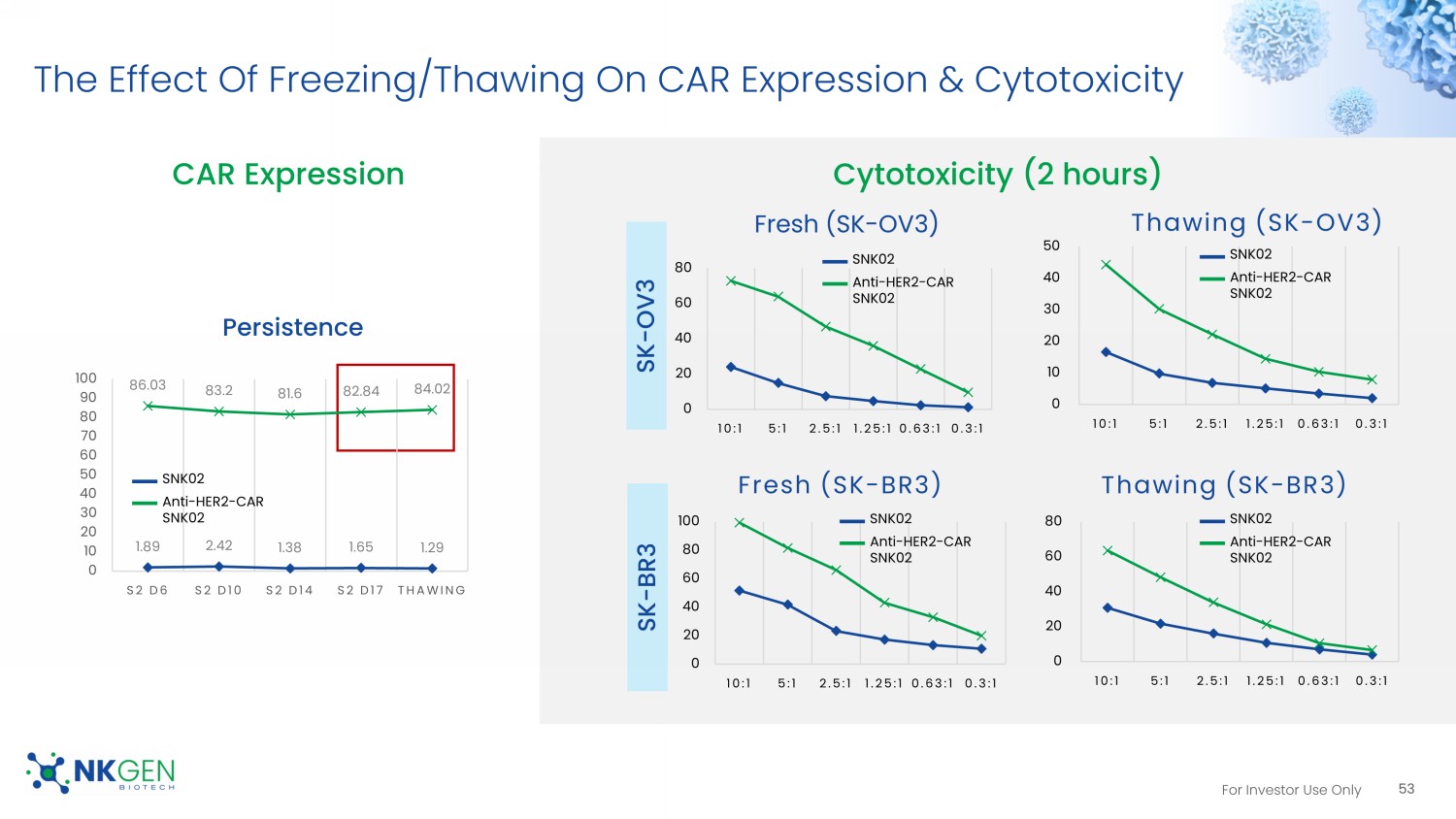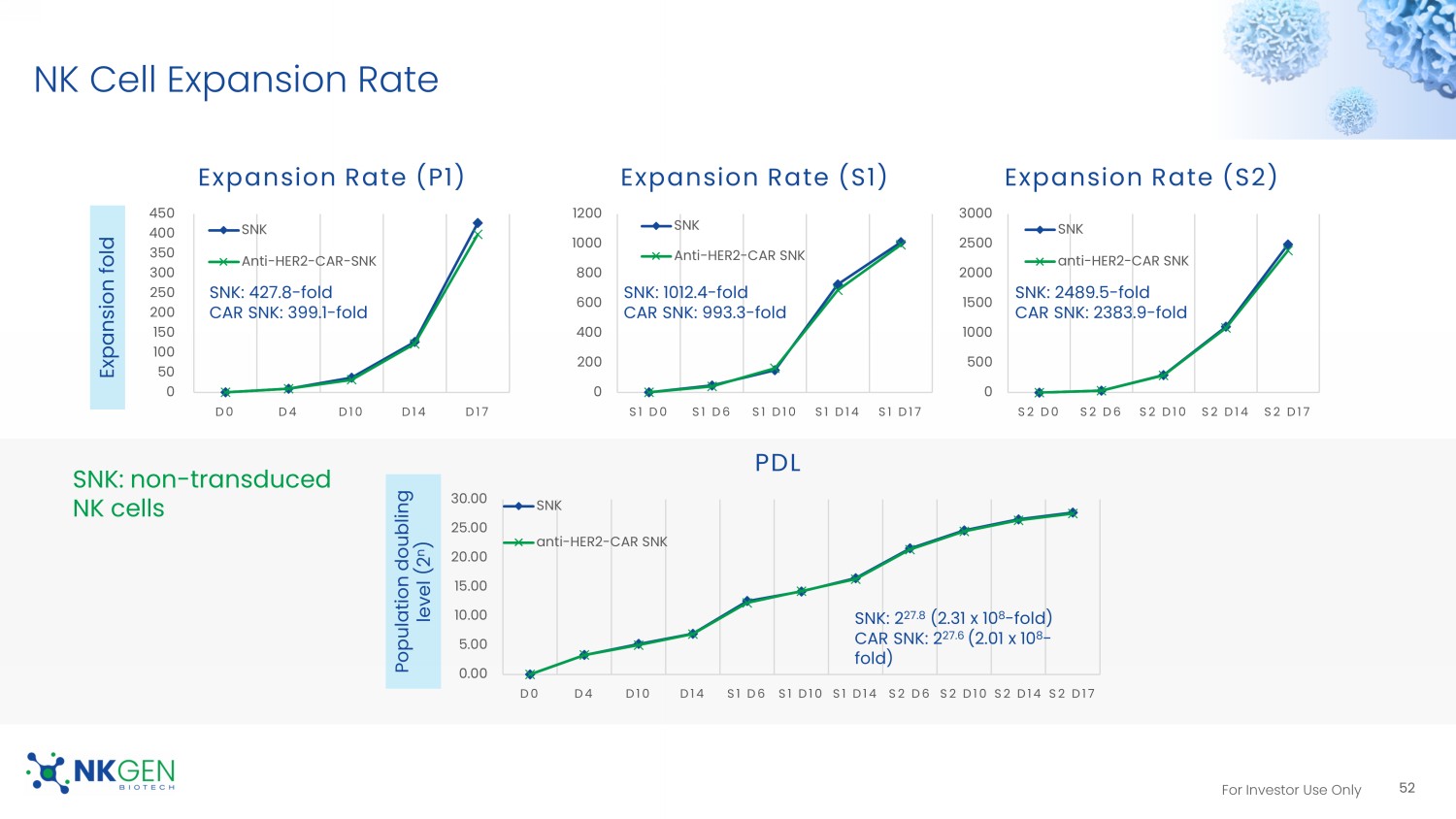 For Investor Use Only NK Cell Expansion Rate 0 50 100 150 200 250 300 350 400 450 D0 D4 D10 D14 D17 Expansion Rate (P1) SNK Anti-HER2-CAR-SNK 0 200 400 600 800 1000 1200 S1 D0 S1 D6 S1 D10 S1 D14 S1 D17 Expansion Rate (S1) SNK Anti-HER2-CAR SNK 0 500 1000 1500 2000 2500 3000 S2 D0 S2 D6 S2 D10 S2 D14 S2 D17 Expansion Rate (S2) SNK anti-HER2-CAR SNK Expansion fold Population doubling level (2 n ) SNK: non - transduced NK cells 0.00 5.00 10.00 15.00 20.00 25.00 30.00 D0 D4 D10 D14 S1 D6 S1 D10 S1 D14 S2 D6 S2 D10 S2 D14 S2 D17 PDL SNK anti-HER2-CAR SNK SNK: 427.8 - fold CAR SNK: 399.1 - fold SNK: 1012.4 - fold CAR SNK: 993.3 - fold SNK: 2489.5 - fold CAR SNK: 2383.9 - fold SNK: 2 27.8 (2.31 x 10 8 - fold) CAR SNK: 2 27.6 (2.01 x 10 8 - fold) 52