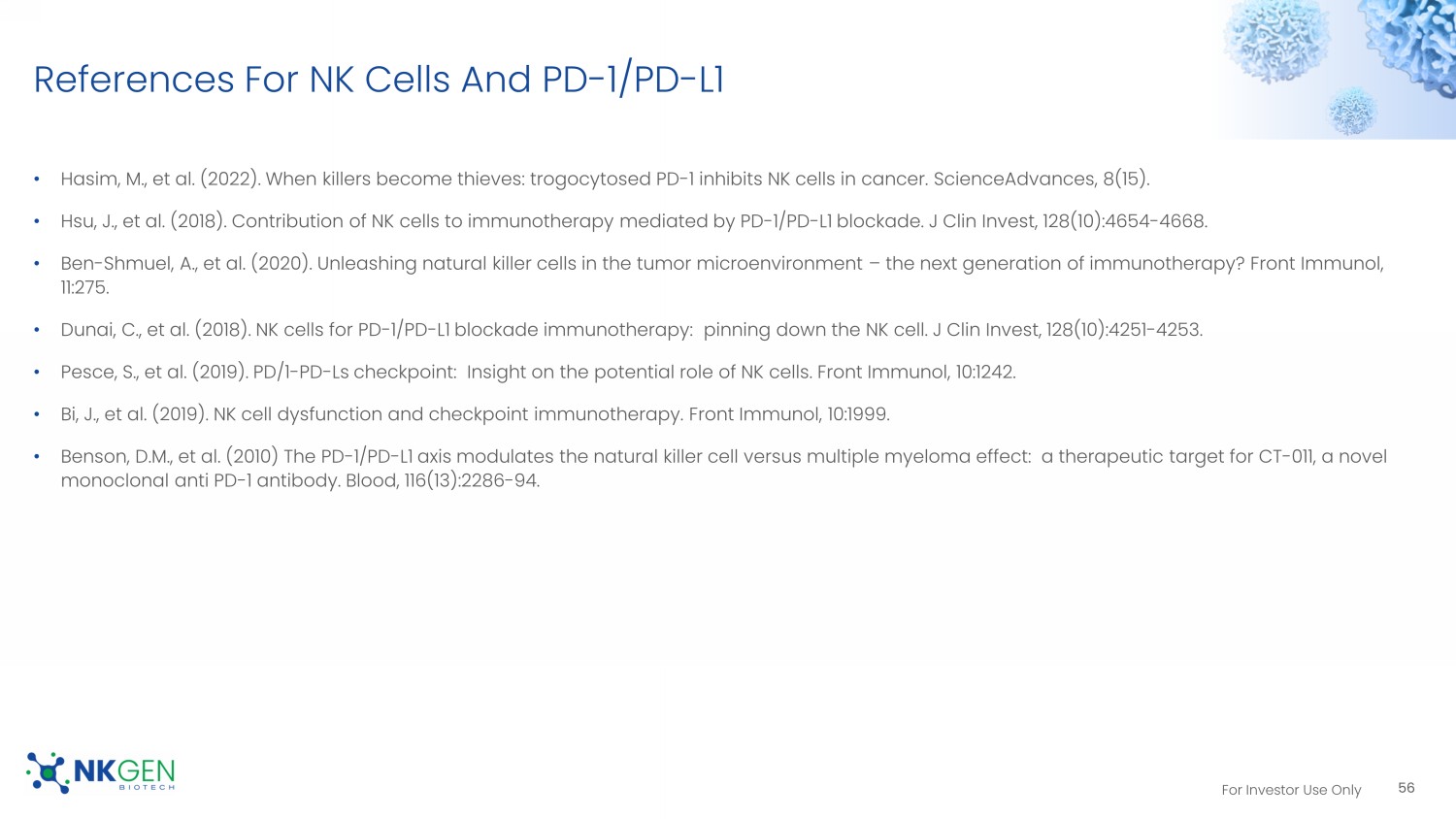 For Investor Use Only References For NK Cells And PD - 1/PD - L1 • Hasim, M., et al. (2022). When killers become thieves: trogocytosed PD - 1 inhibits NK cells in cancer. ScienceAdvances , 8(15). • Hsu, J., et al. (2018). Contribution of NK cells to immunotherapy mediated by PD - 1/PD - L1 blockade. J Clin Invest, 128(10):4654 - 4 668. • Ben - Shmuel, A., et al. (2020). Unleashing natural killer cells in the tumor microenvironment – the next generation of immunother apy? Front Immunol, 11:275. • Dunai, C., et al. (2018). NK cells for PD - 1/PD - L1 blockade immunotherapy: pinning down the NK cell. J Clin Invest, 128(10):4251 - 4253. • Pesce , S., et al. (2019). PD/1 - PD - Ls checkpoint: Insight on the potential role of NK cells. Front Immunol, 10:1242. • Bi, J., et al. (2019). NK cell dysfunction and checkpoint immunotherapy. Front Immunol, 10:1999. • Benson, D.M., et al. (2010) The PD - 1/PD - L1 axis modulates the natural killer cell versus multiple myeloma effect: a therapeutic target for CT - 011, a novel monoclonal anti PD - 1 antibody. Blood, 116(13):2286 - 94. 56