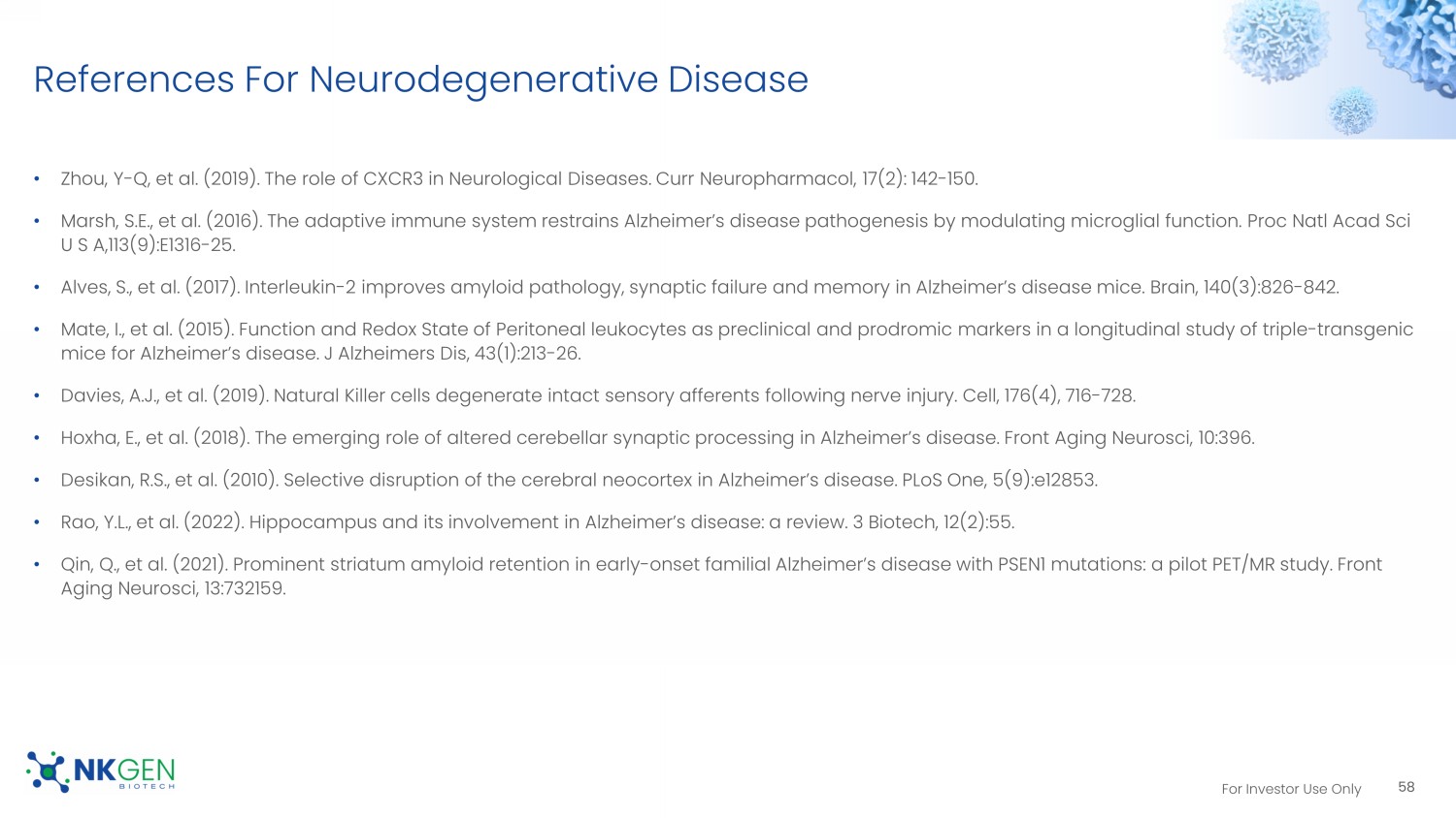 For Investor Use Only References For Neurodegenerative Disease • Zhou, Y - Q, et al. (2019). The role of CXCR3 in Neurological Diseases. Curr Neuropharmacol , 17(2): 142 - 150. • Marsh, S.E., et al. (2016). The adaptive immune system restrains Alzheimer’s disease pathogenesis by modulating microglial fu nct ion. Proc Natl Acad Sci U S A,113(9):E1316 - 25. • Alves, S., et al. (2017). Interleukin - 2 improves amyloid pathology, synaptic failure and memory in Alzheimer’s disease mice. Bra in, 140(3):826 - 842. • Mate, I., et al. (2015). Function and Redox State of Peritoneal leukocytes as preclinical and prodromic markers in a longitud ina l study of triple - transgenic mice for Alzheimer’s disease. J Alzheimers Dis, 43(1):213 - 26. • Davies, A.J., et al. (2019). Natural Killer cells degenerate intact sensory afferents following nerve injury. Cell, 176(4), 7 16 - 728. • Hoxha, E., et al. (2018). The emerging role of altered cerebellar synaptic processing in Alzheimer’s disease. Front Aging Neurosci , 10:396. • Desikan , R.S., et al. (2010). Selective disruption of the cerebral neocortex in Alzheimer’s disease. PLoS One, 5(9):e12853. • Rao, Y.L., et al. (2022). Hippocampus and its involvement in Alzheimer’s disease: a review. 3 Biotech, 12(2):55. • Qin, Q., et al. (2021). Prominent striatum amyloid retention in early - onset familial Alzheimer’s disease with PSEN1 mutations: a pilot PET/MR study. Front Aging Neurosci , 13:732159. 58