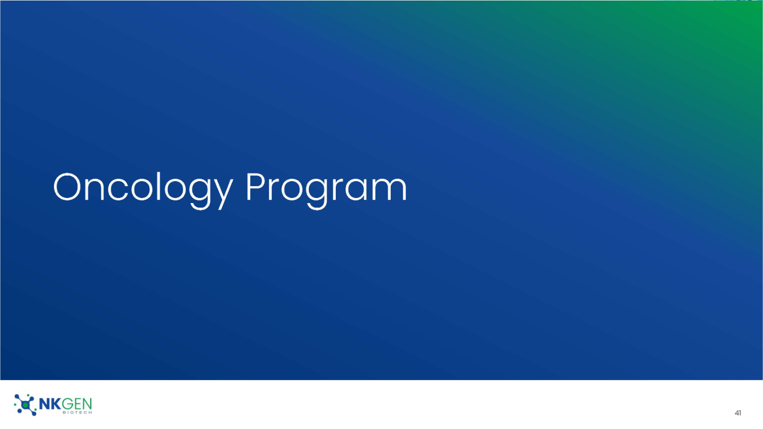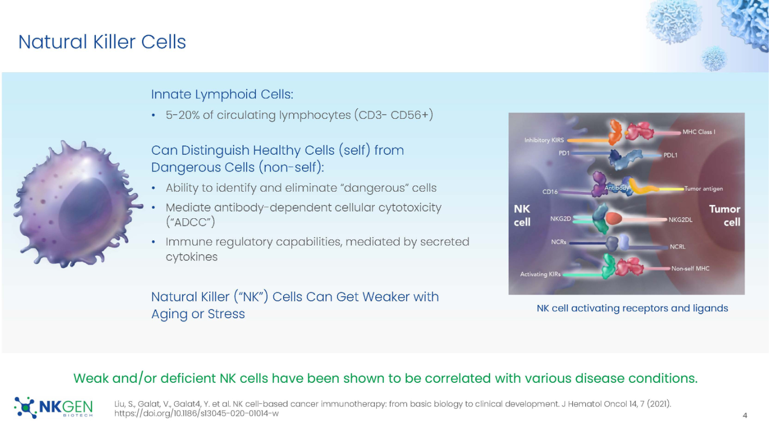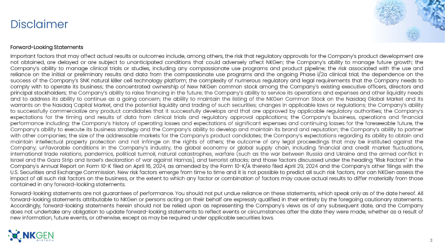 Disclaimer Forward - Looking Statements Important factors that may affect actual results or outcomes include, among others, the risk that regulatory approvals for the Company’s product development are not obtained, are delayed or are subject to unanticipated conditions that could adversely affect NKGen ; the Company’s ability to manage future growth ; the Company’s ability to manage clinical trials or studies, including any compassionate use programs and product pipeline ; the risk associated with the use and reliance on the initial or preliminary results and data from the compassionate use programs and the ongoing Phase I/ 2 a clinical trial ; the dependence on the success of the Company’s SNK natural killer cell technology platform ; the complexity of numerous regulatory and legal requirements that the Company needs to comply with to operate its business ; the concentrated ownership of New NKGen common stock among the Company’s existing executive officers, directors and principal stockholders ; the Company’s ability to raise financing in the future ; the Company’s ability to service its operations and expenses and other liquidity needs and to address its ability to continue as a going concern ; the ability to maintain the listing of the NKGen Common Stock on the Nasdaq Global Market and its warrants on the Nasdaq Capital Market, and the potential liquidity and trading of such securities ; changes in applicable laws or regulations ; the Company’s ability to successfully commercialize any product candidates that it successfully develops and that are approved by applicable regulatory authorities ; the Company’s expectations for the timing and results of data from clinical trials and regulatory approval applications ; the Company’s business, operations and financial performance including : the Company’s history of operating losses and expectations of significant expenses and continuing losses for the foreseeable future, the Company’s ability to execute its business strategy and the Company’s ability to develop and maintain its brand and reputation ; the Company’s ability to partner with other companies ; the size of the addressable markets for the Company’s product candidates ; the Company’s expectations regarding its ability to obtain and maintain intellectual property protection and not infringe on the rights of others ; the outcome of any legal proceedings that may be instituted against the Company ; unfavorable conditions in the Company’s industry, the global economy or global supply chain, including financial and credit market fluctuations, international trade relations, pandemics, political turmoil, natural catastrophes, warfare (such as the war between Russia and Ukraine and the armed conflict in Israel and the Gaza Strip and Israel’s declaration of war against Hamas), and terrorist attacks ; and those factors discussed under the heading “Risk Factors” in the Company's Annual Report on Form 10 - K filed on April 16 , 2024 , as amended by the Form 10 - K/A thereto filed April 29 , 2024 and the Company's other filings with the U . S . Securities and Exchange Commission . New risk factors emerge from time to time and it is not possible to predict all such risk factors, nor can NKGen assess the impact of all such risk factors on the business, or the extent to which any factor or combination of factors may cause actual results to differ materially from those contained in any forward - looking statements . Forward - looking statements are not guarantees of performance . You should not put undue reliance on these statements, which speak only as of the date hereof . All forward - looking statements attributable to NKGen or persons acting on their behalf are expressly qualified in their entirety by the foregoing cautionary statements . Accordingly, forward - looking statements herein should not be relied upon as representing the Company's views as of any subsequent date, and the Company does not undertake any obligation to update forward - looking statements to reflect events or circumstances after the date they were made, whether as a result of new information, future events, or otherwise, except as may be required under applicable securities laws . 3