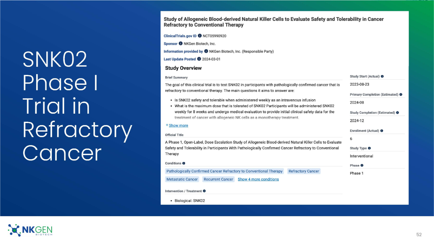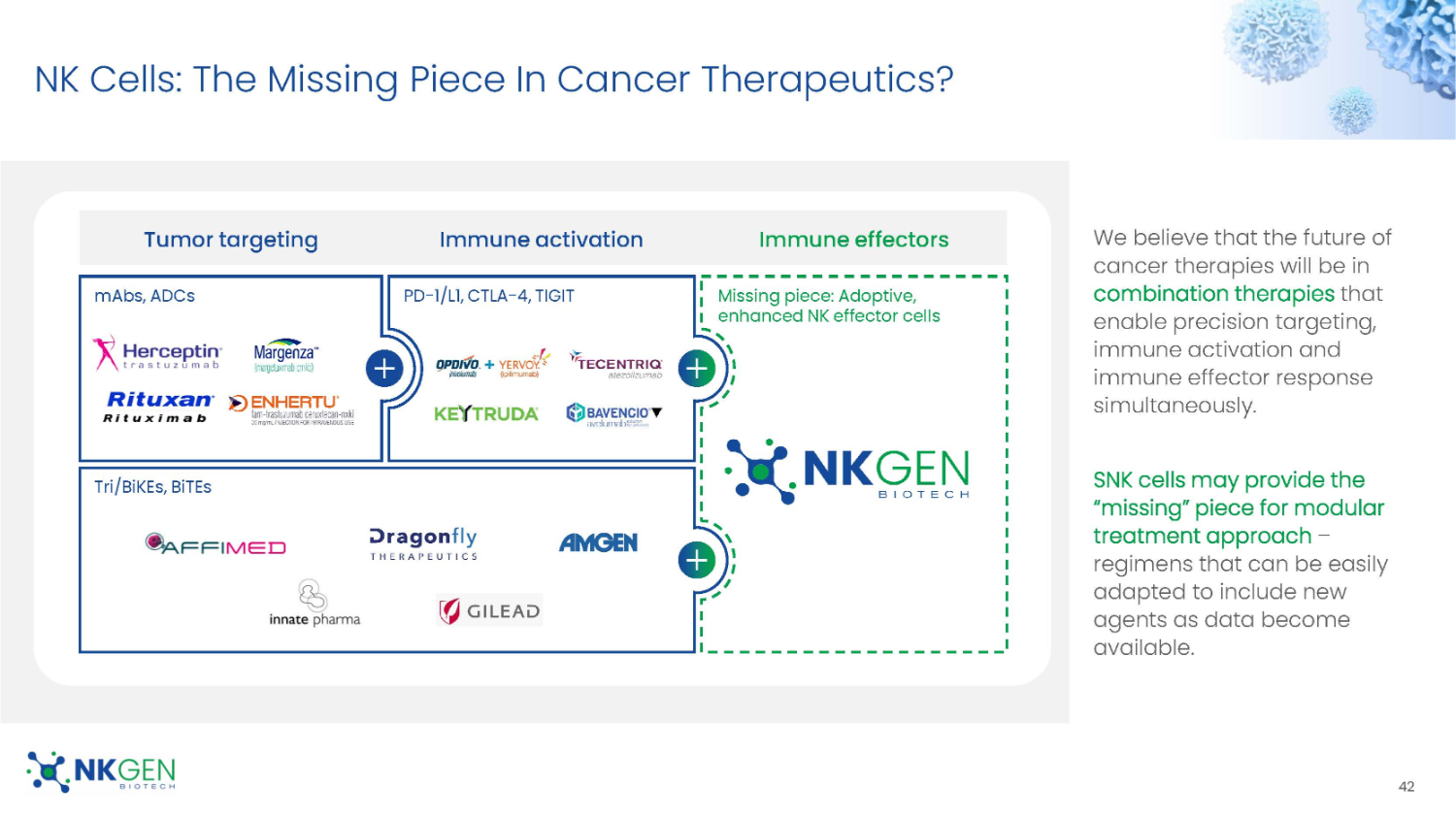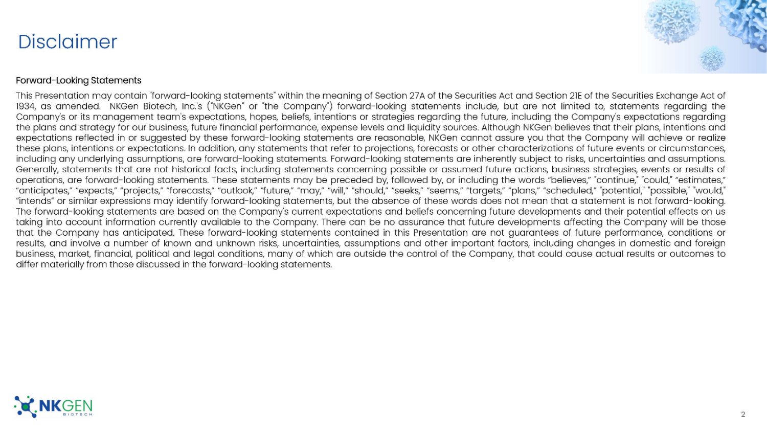 Disclaimer Forward - Looking Statements Important factors that may affect actual results or outcomes include, among others, the risk that regulatory approvals for the Company’s product development are not obtained, are delayed or are subject to unanticipated conditions that could adversely affect NKGen ; the Company’s ability to manage future growth ; the Company’s ability to manage clinical trials or studies, including any compassionate use programs and product pipeline ; the risk associated with the use and reliance on the initial or preliminary results and data from the compassionate use programs and the ongoing Phase I/ 2 a clinical trial ; the dependence on the success of the Company’s SNK natural killer cell technology platform ; the complexity of numerous regulatory and legal requirements that the Company needs to comply with to operate its business ; the concentrated ownership of New NKGen common stock among the Company’s existing executive officers, directors and principal stockholders ; the Company’s ability to raise financing in the future ; the Company’s ability to service its operations and expenses and other liquidity needs and to address its ability to continue as a going concern ; the ability to maintain the listing of the NKGen Common Stock on the Nasdaq Global Market and its warrants on the Nasdaq Capital Market, and the potential liquidity and trading of such securities ; changes in applicable laws or regulations ; the Company’s ability to successfully commercialize any product candidates that it successfully develops and that are approved by applicable regulatory authorities ; the Company’s expectations for the timing and results of data from clinical trials and regulatory approval applications ; the Company’s business, operations and financial performance including : the Company’s history of operating losses and expectations of significant expenses and continuing losses for the foreseeable future, the Company’s ability to execute its business strategy and the Company’s ability to develop and maintain its brand and reputation ; the Company’s ability to partner with other companies ; the size of the addressable markets for the Company’s product candidates ; the Company’s expectations regarding its ability to obtain and maintain intellectual property protection and not infringe on the rights of others ; the outcome of any legal proceedings that may be instituted against the Company ; unfavorable conditions in the Company’s industry, the global economy or global supply chain, including financial and credit market fluctuations, international trade relations, pandemics, political turmoil, natural catastrophes, warfare (such as the war between Russia and Ukraine and the armed conflict in Israel and the Gaza Strip and Israel’s declaration of war against Hamas), and terrorist attacks ; and those factors discussed under the heading “Risk Factors” in the Company's Annual Report on Form 10 - K filed on April 16 , 2024 , as amended by the Form 10 - K/A thereto filed April 29 , 2024 and the Company's other filings with the U . S . Securities and Exchange Commission . New risk factors emerge from time to time and it is not possible to predict all such risk factors, nor can NKGen assess the impact of all such risk factors on the business, or the extent to which any factor or combination of factors may cause actual results to differ materially from those contained in any forward - looking statements . Forward - looking statements are not guarantees of performance . You should not put undue reliance on these statements, which speak only as of the date hereof . All forward - looking statements attributable to NKGen or persons acting on their behalf are expressly qualified in their entirety by the foregoing cautionary statements . Accordingly, forward - looking statements herein should not be relied upon as representing the Company's views as of any subsequent date, and the Company does not undertake any obligation to update forward - looking statements to reflect events or circumstances after the date they were made, whether as a result of new information, future events, or otherwise, except as may be required under applicable securities laws . 3