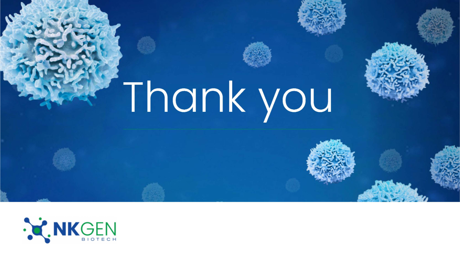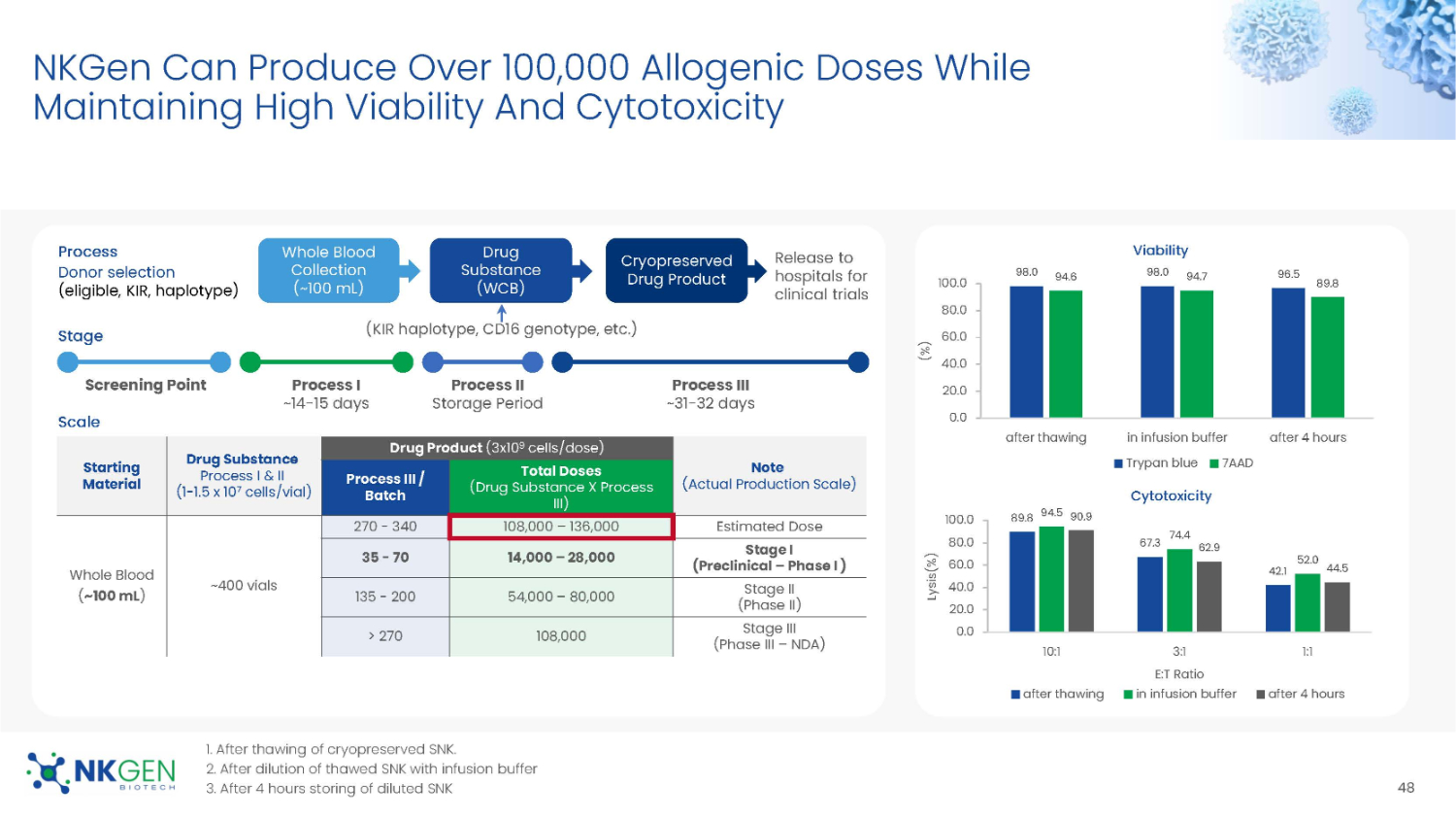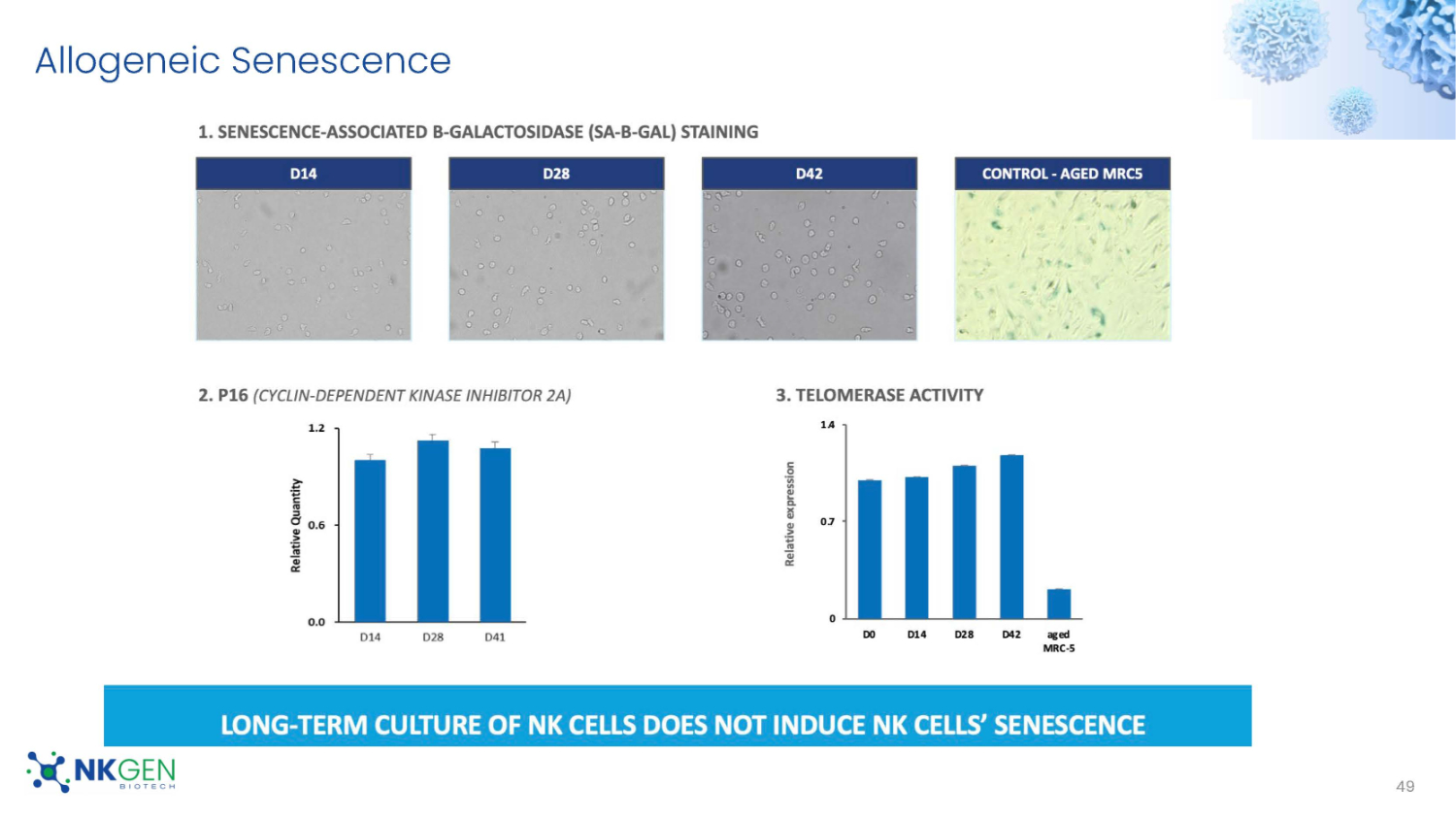 NKGen Can Produce Over 100,000 Allogenic Doses While Maintaining High Viability And Cytotoxicity 48 98.0 98.0 96.5 94.6 94.7 89.8 0.0 20.0 40.0 60.0 80.0 100.0 after thawing in infusion buffer after 4 hours (%) Viability Trypan blue 7AAD 89.8 67.3 42.1 94.5 74.4 52.0 90.9 62.9 44.5 0.0 20.0 40.0 60.0 80.0 100.0 10:1 3:1 1:1 Lysis(%) E:T Ratio Cytotoxicity after thawing in infusion buffer after 4 hours Process I ~14 - 15 days Screening Point Process II Storage Period Process III ~31 - 32 days 1. After thawing of cryopreserved SNK. 2. After dilution of thawed SNK with infusion buffer 3. After 4 hours storing of diluted SNK Process Whole Blood Collection (~100 mL) Drug Substance (WCB) Cryopreserved Drug Product Donor selection (eligible, KIR, haplotype) Release to hospitals for clinical trials (KIR haplotype, CD16 genotype, etc.) Stage Scale Note (Actual Production Scale) Drug Product (3 x10 9 cells/dose) Drug Substance Process I & II (1 - 1.5 x 10 7 cells/vial) Starting Material Total Doses (Drug Substance X Process III) Process III / Batch Estimated Dose 108,000 – 136,000 270 - 340 ~400 vials Whole Blood ( ~100 mL ) Stage I (Preclinical – Phase I ) 14,000 – 28,000 35 - 70 Stage II (Phase II) 54,000 – 80,000 135 - 200 Stage III (Phase III – NDA) 108,000 > 270