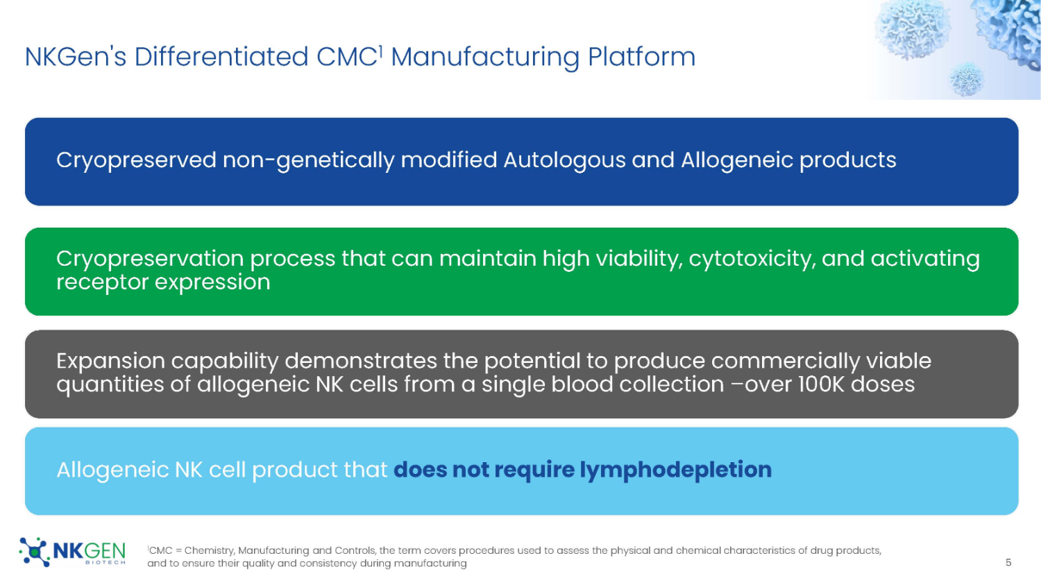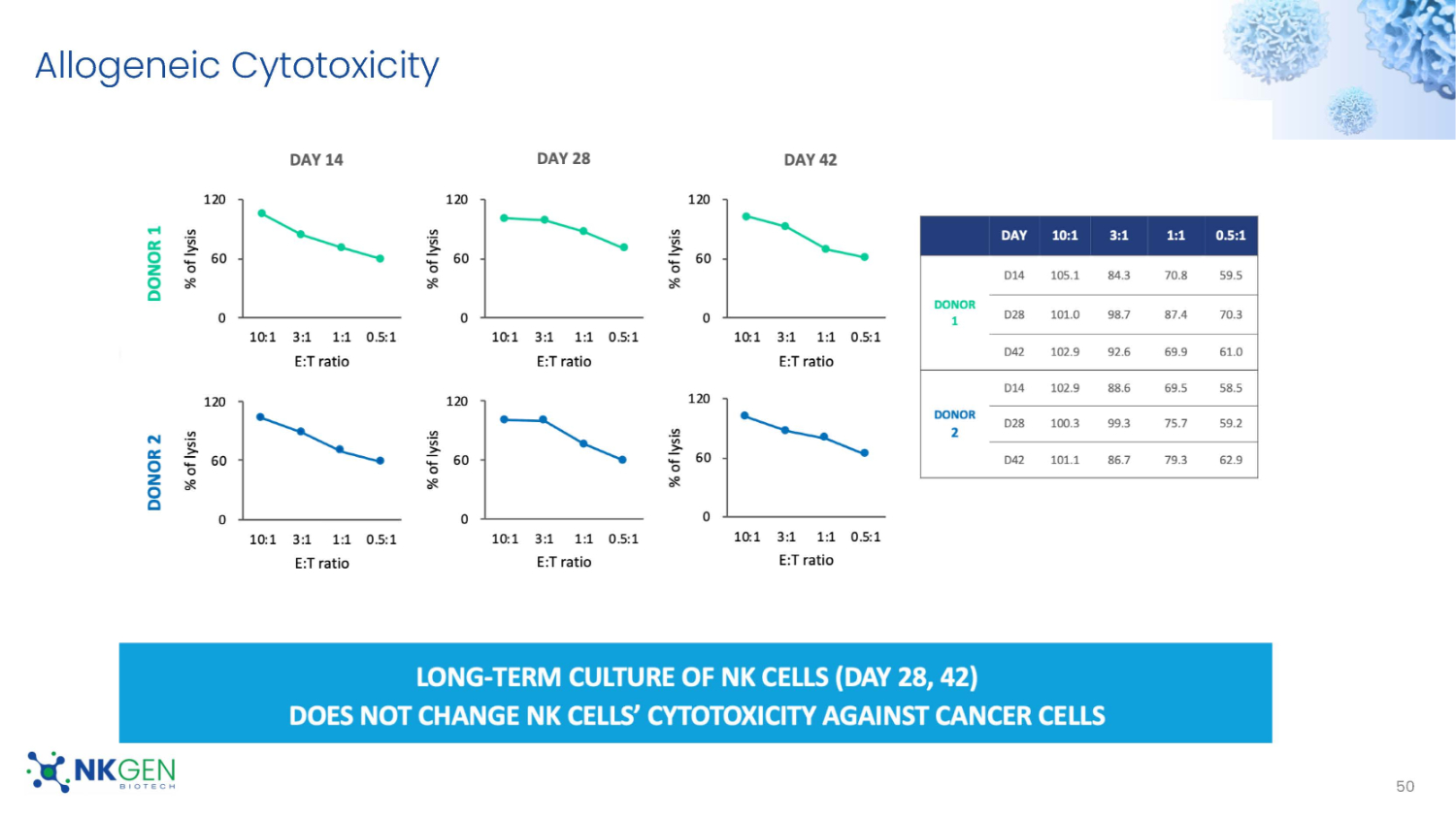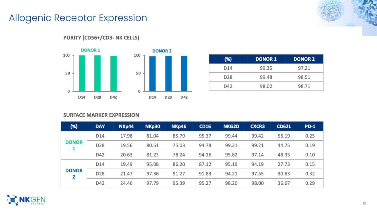 NKGen Can Produce Over 100,000 Allogenic Doses While Maintaining High Viability And Cytotoxicity 48 98.0 98.0 96.5 94.6 94.7 89.8 0.0 20.0 40.0 60.0 80.0 100.0 after thawing in infusion buffer after 4 hours (%) Viability Trypan blue 7AAD 89.8 67.3 42.1 94.5 74.4 52.0 90.9 62.9 44.5 0.0 20.0 40.0 60.0 80.0 100.0 10:1 3:1 1:1 Lysis(%) E:T Ratio Cytotoxicity after thawing in infusion buffer after 4 hours Process I ~14 - 15 days Screening Point Process II Storage Period Process III ~31 - 32 days 1. After thawing of cryopreserved SNK. 2. After dilution of thawed SNK with infusion buffer 3. After 4 hours storing of diluted SNK Process Whole Blood Collection (~100 mL) Drug Substance (WCB) Cryopreserved Drug Product Donor selection (eligible, KIR, haplotype) Release to hospitals for clinical trials (KIR haplotype, CD16 genotype, etc.) Stage Scale Note (Actual Production Scale) Drug Product (3 x10 9 cells/dose) Drug Substance Process I & II (1 - 1.5 x 10 7 cells/vial) Starting Material Total Doses (Drug Substance X Process III) Process III / Batch Estimated Dose 108,000 – 136,000 270 - 340 ~400 vials Whole Blood ( ~100 mL ) Stage I (Preclinical – Phase I ) 14,000 – 28,000 35 - 70 Stage II (Phase II) 54,000 – 80,000 135 - 200 Stage III (Phase III – NDA) 108,000 > 270