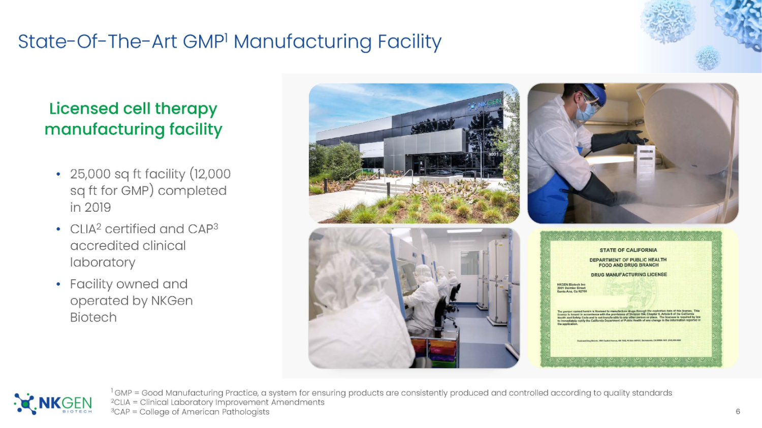 NKGen's Differentiated CMC 1 Manufacturing Platform 5 1 CMC = Chemistry, Manufacturing and Controls, the term covers procedures used to assess the physical and chemical characterist ics of drug products, and to ensure their quality and consistency during manufacturing Cryopreserved non - genetically modified Autologous and Allogeneic products Expansion capability demonstrates the potential to produce commercially viable quantities of allogeneic NK cells from a single blood collection – over 100K doses Cryopreservation process that can maintain high viability, cytotoxicity, and activating receptor expression Allogeneic NK cell product that does not require lymphodepletion