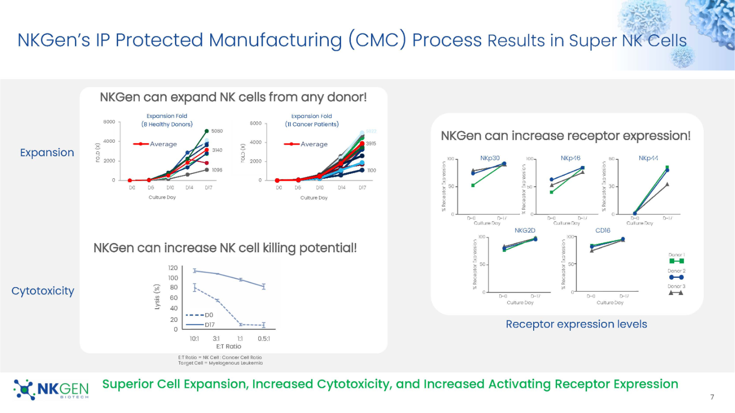 State - Of - The - Art GMP 1 Manufacturing Facility Licensed cell therapy manufacturing facility • 25,000 sq ft facility (12,000 sq ft for GMP) completed in 2019 • CLIA 2 certified and CAP 3 accredited clinical laboratory • Facility owned and operated by NKGen Biotech 6 1 GMP = Good Manufacturing Practice, a system for ensuring products are consistently produced and controlled according to quali ty standards 2 CLIA = Clinical Laboratory Improvement Amendments 3 CAP = College of American Pathologists