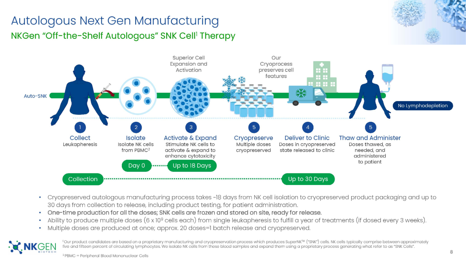 NKGen’s IP Protected Manufacturing (CMC) Process Results in Super NK Cells Cytotoxicity Expansion 7 1100 3915 0 2000 4000 6000 FOLD (X) Culture Day Expansion Fold (11 Cancer Patients) 5022 D0 D6 D10 D14 D17 D0 D6 D10 D14 D17 E:T Ratio E:T Ratio = NK Cell : Cancer Cell Ratio Target Cell = Myelogenous Leukemia 10:1 3:1 1:1 0.5:1 Lysis (%) 120 100 80 60 40 20 0 D0 D17 50 % Receptor Expression NKp30 Culture Day % Receptor Expression NKp46 NKp44 NKG2D CD16 Culture Day 100 50 0 Culture Day Culture Day Culture Day 100 0 60 30 0 % Receptor Expression % Receptor Expression 100 50 0 % Receptor Expression 100 50 0 D - 0 D - 17 D - 0 D - 17 D - 0 D - 17 D - 0 D - 17 D - 0 D - 17 Donor 1 Donor 2 Donor 3 1096 5060 3140 0 2000 4000 6000 FOLD (X) Culture Day Expansion Fold (8 Healthy Donors) NKGen can expand NK cells from any donor! NKGen can increase NK cell killing potential! NKGen can increase receptor expression! Superior Cell Expansion, Increased Cytotoxicity, and Increased Activating Receptor Expression Receptor expression levels