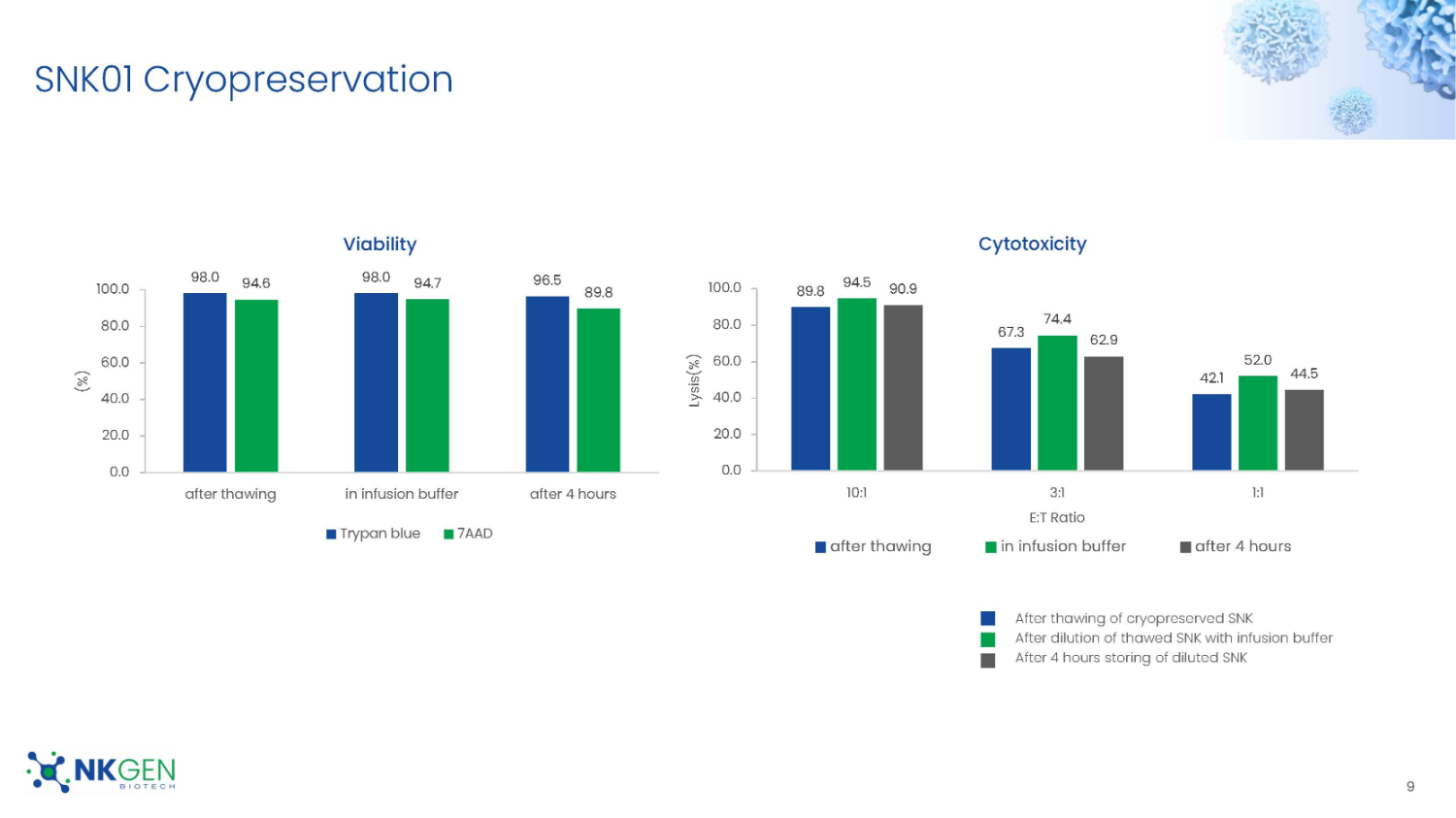 Autologous Next Gen Manufacturing NKGen “Off - the - Shelf Autologous” SNK Cell 1 Therapy • Cryopreserved autologous manufacturing process takes ~18 days from NK cell isolation to cryopreserved product packaging and u p t o 30 days from collection to release, including product testing, for patient administration. • One - time production for all the doses; SNK cells are frozen and stored on site, ready for release. • Ability to produce multiple doses (6 x 10 9 cells each) from single leukapheresis to fulfill a year of treatments (if dosed every 3 weeks). • Multiple doses are produced at once; approx. 20 doses=1 batch release and cryopreserved. 8 Superior Cell Expansion and Activation Our Cryoprocess preserves cell features Day 0 Up to 18 Days Auto - SNK No Lymphodepletion Collect Leukapheresis Isolate Isolate NK cells from PBMC 2 2 Activate & Expand Stimulate NK cells to activate & expand to enhance cytotoxicity 3 4 Deliver to Clinic Doses in cryopreserved state released to clinic 1 Thaw and Administer Doses thawed, as needed, and administered to patient 5 5 Cryopreserve Multiple doses cryopreserved Collection Up to 30 Days 1 Our product candidates are based on a proprietary manufacturing and cryopreservation process which produces SuperNK TM (“SNK”) cells. NK cells typically comprise between approximately five and fifteen percent of circulating lymphocytes. We isolate NK cells from these blood samples and expand them using a pro pri etary process generating what refer to as “SNK Cells”. 2 PBMC = Peripheral Blood Mononuclear Cells