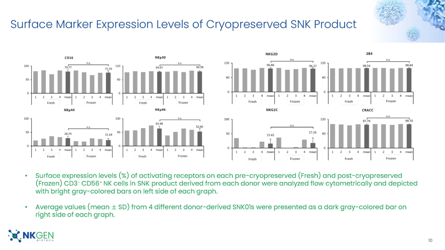 SNK01 Cryopreservation 9 98.0 98.0 96.5 94.6 94.7 89.8 0.0 20.0 40.0 60.0 80.0 100.0 after thawing in infusion buffer after 4 hours (%) Viability Trypan blue 7AAD 89.8 67.3 42.1 94.5 74.4 52.0 90.9 62.9 44.5 0.0 20.0 40.0 60.0 80.0 100.0 10:1 3:1 1:1 Lysis(%) E:T Ratio Cytotoxicity after thawing in infusion buffer after 4 hours After thawing of cryopreserved SNK After dilution of thawed SNK with infusion buffer After 4 hours storing of diluted SNK