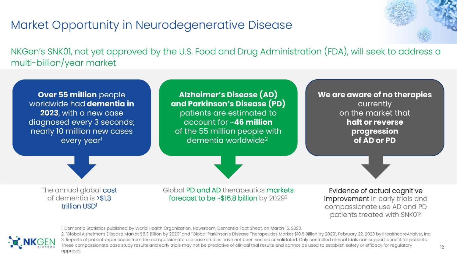 Market Opportunity in Neurodegenerative Disease NKGen’s SNK01, not yet approved by the U.S. Food and Drug Administration (FDA), will seek to address a multi - billion/year market 12 1. Dementia Statistics published by World Health Organization, Newsroom, Dementia Fact Sheet, on March 15, 2023. 2. "Global Alzheimer’s Disease Market $6.3 Billion by 2029" and "Global Parkinson’s Disease Therapeutics Market $10.5 Billion by 2029", February 22, 2023 by iHealthcareAnalyst , Inc. 3. Reports of patient experiences from the compassionate use case studies have not been verified or validated. Only controlle d c linical trials can support benefit for patients. These compassionate case study results and early trials may not be predictive of clinical trial results and cannot be used to es tablish safety or efficacy for regulatory approval. We are aware of no therapies currently on the market that halt or reverse progression of AD or PD Alzheimer’s Disease (AD) and Parkinson’s Disease (PD) patients are estimated to account for ~ 46 million of the 55 million people with dementia worldwide 2 Over 55 million people worldwide had dementia in 2023 , with a new case diagnosed every 3 seconds; nearly 10 million new cases every year 1 Evidence of actual cognitive improvement in early trials and compassionate use AD and PD patients treated with SNK01 3 Global PD and AD therapeutics markets forecast to be ~$16.8 billion by 2029 2 The annual global cost of dementia is >$1.3 trillion USD 1