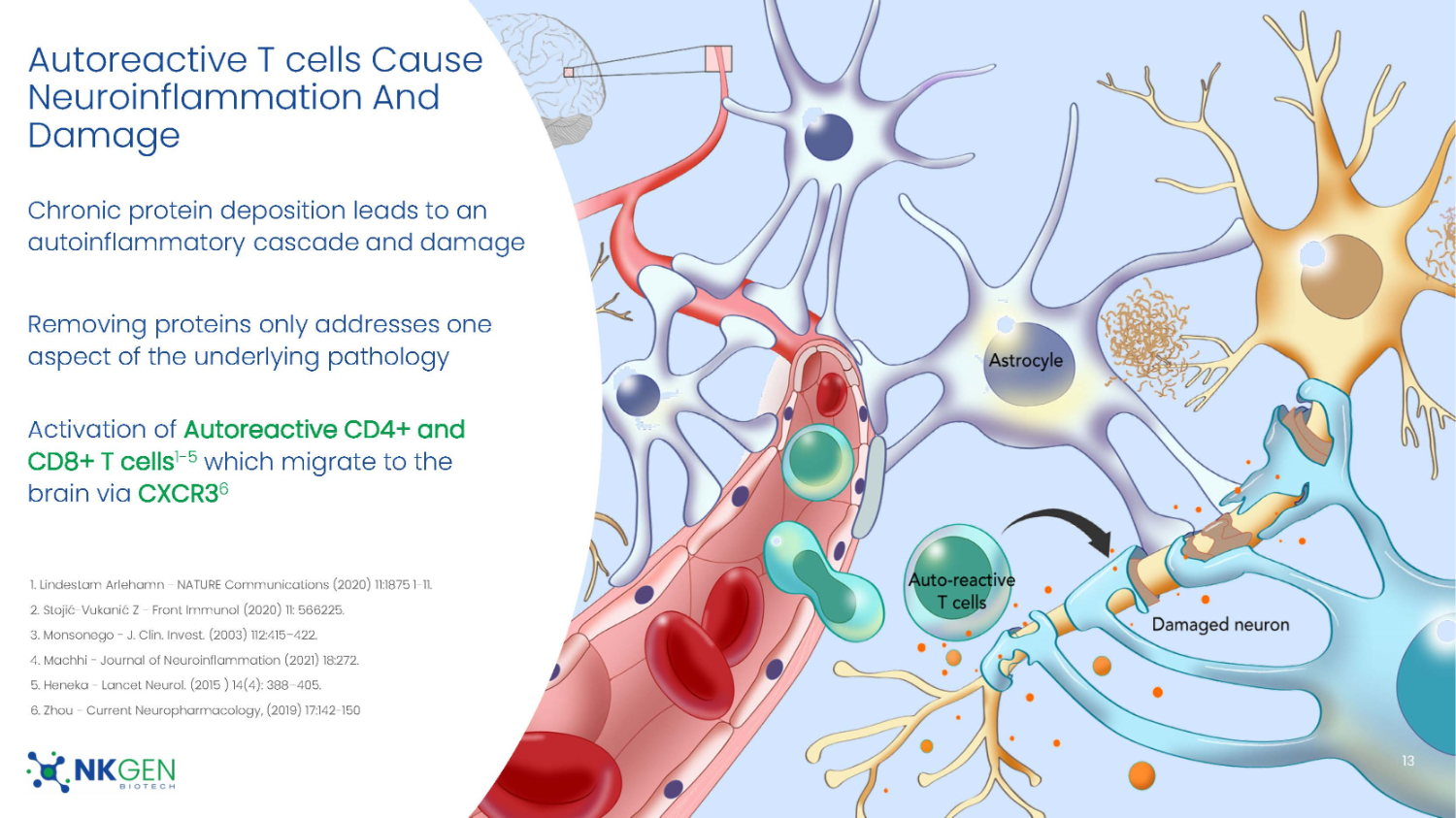 Chronic protein deposition leads to an autoinflammatory cascade and damage Removing proteins only addresses one aspect of the underlying pathology Activation of Autoreactive CD4+ and CD8+ T cells 1 - 5 which migrate to the brain via CXCR3 6 13 1. Lindestam Arlehamn - NATURE Communications (2020) 11:1875 1 - 11. 2. Stojić - Vukanić Z - Front Immunol (2020) 11: 566225. 3. Monsonego - J. Clin. Invest. (2003) 112:415 – 422. 4. Machhi - Journal of Neuroinflammation (2021) 18:272. 5. Heneka - Lancet Neurol. (2015 ) 14(4): 388 – 405. 6. Zhou - Current Neuropharmacology, (2019) 17:142 - 150 Autoreactive T cells Cause Neuroinflammation And Damage