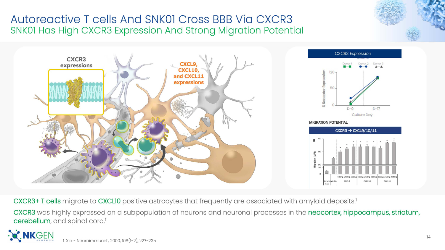 Autoreactive T cells And SNK01 Cross BBB Via CXCR3 SNK01 Has High CXCR3 Expression And Strong Migration Potential CXCR3+ T cells migrate to CXCL10 positive astrocytes that frequently are associated with amyloid deposits. 1 CXCR3 was highly expressed on a subpopulation of neurons and neuronal processes in the neocortex, hippocampus, striatum, cerebellum , and spinal cord. 1 1. Xia - Neuroimmunol ., 2000, 108(1 - 2), 227 - 235. 14 CXCR3 Expression