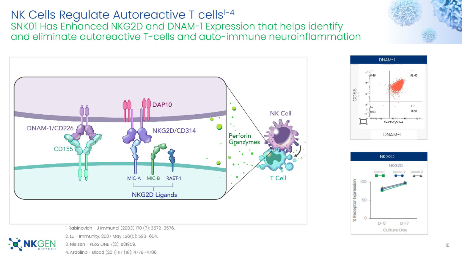 NK Cells Regulate Autoreactive T cells 1 - 4 SNK01 Has Enhanced NKG2D and DNAM - 1 Expression that helps identify and eliminate autoreactive T - cells and auto - immune neuroinflammation 15 1. Rabinovich - J Immunol (2003) 170 (7): 3572 – 3576. 2. Lu - Immunity. 2007 May ; 26(5): 593 – 604. 3. Nielsen - PLoS ONE 7(2): e31959. 4. Ardolino - Blood (2011) 117 (18): 4778 – 4786. DNAM - 1 NKG2D CD56 DNAM - 1