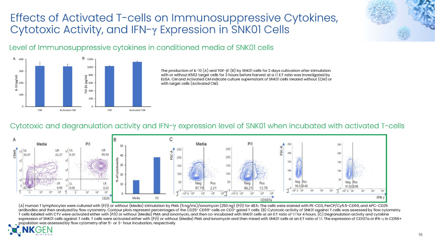 Effects of Activated T - cells on Immunosuppressive Cytokines, Cytotoxic Activity, and IFN - γ Expression in SNK01 Cells 16 The production of IL - 10 (A) and TGF - β 1 (B) by SNK01 cells for 2 days cultivation after stimulation with or without K562 target cells for 3 hours before harvest at a 1:1 E:T ratio was investigated by ELISA. CM and Activated CM indicate culture supernatant of SNK01 cells treated without (CM) or with target cells (Activated CM). (A) Human T lymphocytes were cultured with (P/I) or without (Media) stimulation by PMA (5   ng/mL)/ionomycin (250   ng) (P/I) for 48   h. The cells were stained with PE - CD3, PerCP /Cy5.5 - CD69, and APC - CD25 antibodies and then analyzed by flow cytometry. Contour plots represent percentages of the CD25 + CD69 + cells on CD3 + gated T cells. (B) Cytotoxic activity of SNK01 against T cells was assessed by flow cytometry. T cells labeled with CTV were activated either with (P/I) or without (Media) PMA and ionomycin, and then co - incubated with SNK01 cells at an E:T ratio of 1:1 for 4 hours. (C) Degranulation activity and cytokine expression of SNK01 cells against T cells. T cells were activated either with (P/I) or without (Media) PMA and ionomycin and the n mixed with SNK01 cells at an E:T ratio of 1:1. The expression of CD107a or IFN - γ in CD56+ population was assessed by flow cytometry after 5 - or 3 - hour incubation, respectively . Level of Immunosuppressive cytokines in conditioned media of SNK01 cells Cytotoxic and degranulation activity and IFN - γ expression level of SNK01 when incubated with activated T - cells