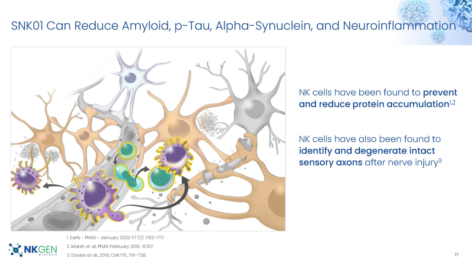SNK01 Can Reduce Amyloid, p - Tau, Alpha - Synuclein, and Neuroinflammation NK cells have been found to prevent and reduce protein accumulation 1,2 NK cells have also been found to identify and degenerate intact sensory axons after nerve injury 3 17 1. Earls - PNAS - January 2020 117 (3) 1762 - 1771. 2. Marsh et al. PNAS February 2016 - E1317. 3. Davies et al., 2019, Cell 176, 716 – 728.