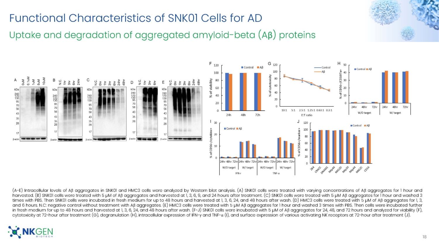 18 (A - E) Intracellular levels of A β aggregates in SNK 01 and HMC 3 cells were analyzed by Western blot analysis . (A) SNK 01 cells were treated with varying concentrations of A β aggregates for 1 hour and harvested . (B) SNK 01 cells were treated with 5 µM of A β aggregates and harvested at 1 , 3 , 6 , 9 , and 24 hours after treatment . (C) SNK 01 cells were treated with 5 µM A β aggregates for 1 hour and washed 3 times with PBS . Then SNK 01 cells were incubated in fresh medium for up to 48 hours and harvested at 1 , 3 , 6 , 24 , and 48 hours after wash . (D) HMC 3 cells were treated with 5 µM of A β aggregates for 1 , 3 , and 6 hours . N . C : negative control without treatment with A β aggregates . (E) HMC 3 cells were treated with 5 µM A β aggregates for 1 hour and washed 3 times with PBS . Then cells were incubated further in fresh medium for up to 48 hours and harvested at 1 , 3 , 6 , 24 , and 48 hours after wash . (F - J) SNK 01 cells were incubated with 5 µM of A β aggregates for 24 , 48 , and 72 hours and analyzed for viability (F), cytotoxicity at 72 - hour after treatment (G), degranulation (H), intracellular expression of IFN - γ and TNF - α (I), and surface expression of various activating NK receptors at 72 - hour after treatment (J) . Functional Characteristics of SNK01 Cells for AD Uptake and degradation of aggregated amyloid - beta (A β ) proteins