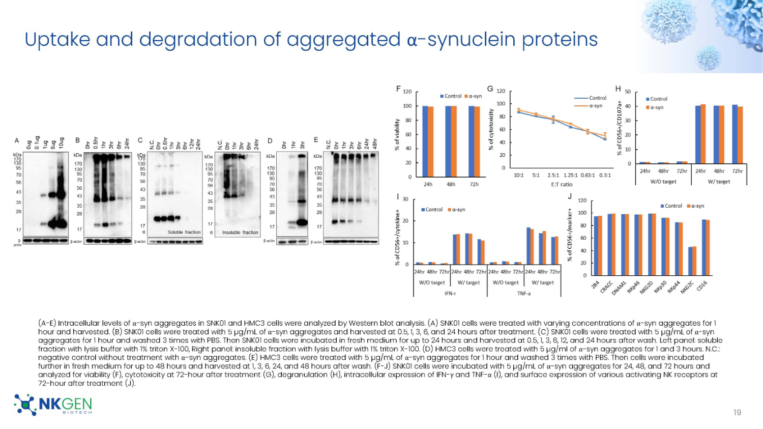19 Uptake and degradation of aggregated α - synuclein proteins (A - E) Intracellular levels of α - syn aggregates in SNK01 and HMC3 cells were analyzed by Western blot analysis. (A) SNK01 cells were treated with varying conc en trations of α - syn aggregates for 1 hour and harvested. (B) SNK01 cells were treated with 5 µg/mL of α - syn aggregates and harvested at 0.5, 1, 3, 6, and 24 hours after treatment. (C) SNK01 cells were treated with 5 µg/mL of α - syn aggregates for 1 hour and washed 3 times with PBS. Then SNK01 cells were incubated in fresh medium for up to 24 hours and har ves ted at 0.5, 1, 3, 6, 12, and 24 hours after wash. Left panel: soluble fraction with lysis buffer with 1% triton X - 100, Right panel: insoluble fraction with lysis buffer with 1% triton X - 100. (D) HMC 3 cells were treated with 5 µg/ml of α - syn aggregates for 1 and 3 hours. N.C.: negative control without treatment with α - syn aggregates. (E) HMC3 cells were treated with 5 µg/mL of α - syn aggregates for 1 hour and washed 3 times with PBS. Then cells were incubated further in fresh medium for up to 48 hours and harvested at 1, 3, 6, 24, and 48 hours after wash. (F - J) SNK01 cells were incubat ed with 5 µg/mL of α - syn aggregates for 24, 48, and 72 hours and analyzed for viability (F), cytotoxicity at 72 - hour after treatment (G), degranulation (H), intracellular expression of IFN - γ and TNF - α (I), and surface expression of various activating NK receptors at 72 - hour after treatment (J).