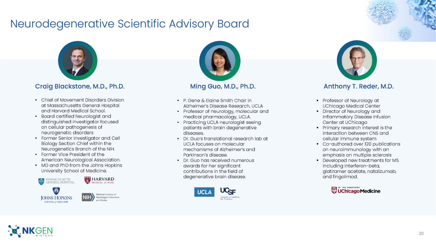 20 Neurodegenerative Scientific Advisory Board Craig Blackstone, M.D., Ph.D . • Chief of Movement Disorders Division at Massachusetts General Hospital and Harvard Medical School. • Board certified Neurologist and distinguished investigator focused on cellular pathogenesis of neurogenetic disorders • Former Senior Investigator and Cell Biology Section Chief within the Neurogenetics Branch of the NIH. • Former Vice President of the American Neurological Association. • MD and PhD from the Johns Hopkins University School of Medicine. Ming Guo, M.D., Ph.D. • P. Gene & Elaine Smith Chair in Alzheimer’s Disease Research, UCLA • Professor of neurology, molecular and medical pharmacology, UCLA. • Practicing UCLA neurologist seeing patients with brain degenerative diseases. • Dr. Guo’s translational research lab at UCLA focuses on molecular mechanisms of Alzheimer’s and Parkinson’s disease. • Dr. Guo has received numerous awards for her significant contributions in the field of degenerative brain disease. Anthony T. Reder, M.D. ▪ Professor of Neurology at UChicago Medical Center ▪ Director of Neurology and Inflammatory Disease Infusion Center at UChicago ▪ Primary research interest is the interaction between CNS and cellular immune system ▪ Co - authored over 120 publications on neuroimmunology with an emphasis on multiple sclerosis ▪ Developed new treatments for MS including interferon - beta, glatiramer acetate, natalizumab, and fingolimod.
