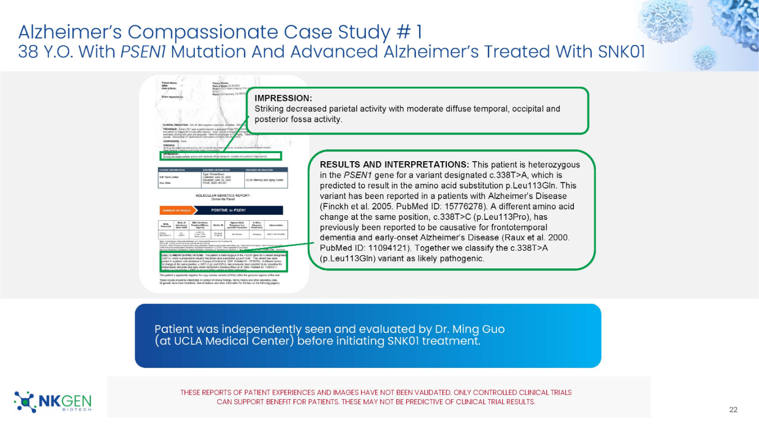 Alzheimer’s Compassionate Case Study # 1 38 Y.O. With PSEN1 Mutation And Advanced Alzheimer’s Treated With SNK01 THESE REPORTS OF PATIENT EXPERIENCES AND IMAGES HAVE NOT BEEN VALIDATED. ONLY CONTROLLED CLINICAL TRIALS CAN SUPPORT BENEFIT FOR PATIENTS. THESE MAY NOT BE PREDICTIVE OF CLINICAL TRIAL RESULTS. 22 Patient was independently seen and evaluated by Dr. Ming Guo (at UCLA Medical Center) before initiating SNK01 treatment. IMPRESSION: Striking decreased parietal activity with moderate diffuse temporal, occipital and posterior fossa activity. RESULTS AND INTERPRETATIONS: This patient is heterozygous in the PSEN1 gene for a variant designated c.338T>A, which is predicted to result in the amino acid substitution p.Leu113Gln. This variant has been reported in a patients with Alzheimer’s Disease ( Finckh et al. 2005. PubMed ID: 15776278). A different amino acid change at the same position, c.338T>C (p.Leu113Pro), has previously been reported to be causative for frontotemporal dementia and early - onset Alzheimer’s Disease ( Raux et al. 2000. PubMed ID: 11094121). Together we classify the c.338T>A (p.Leu113Gln) variant as likely pathogenic.