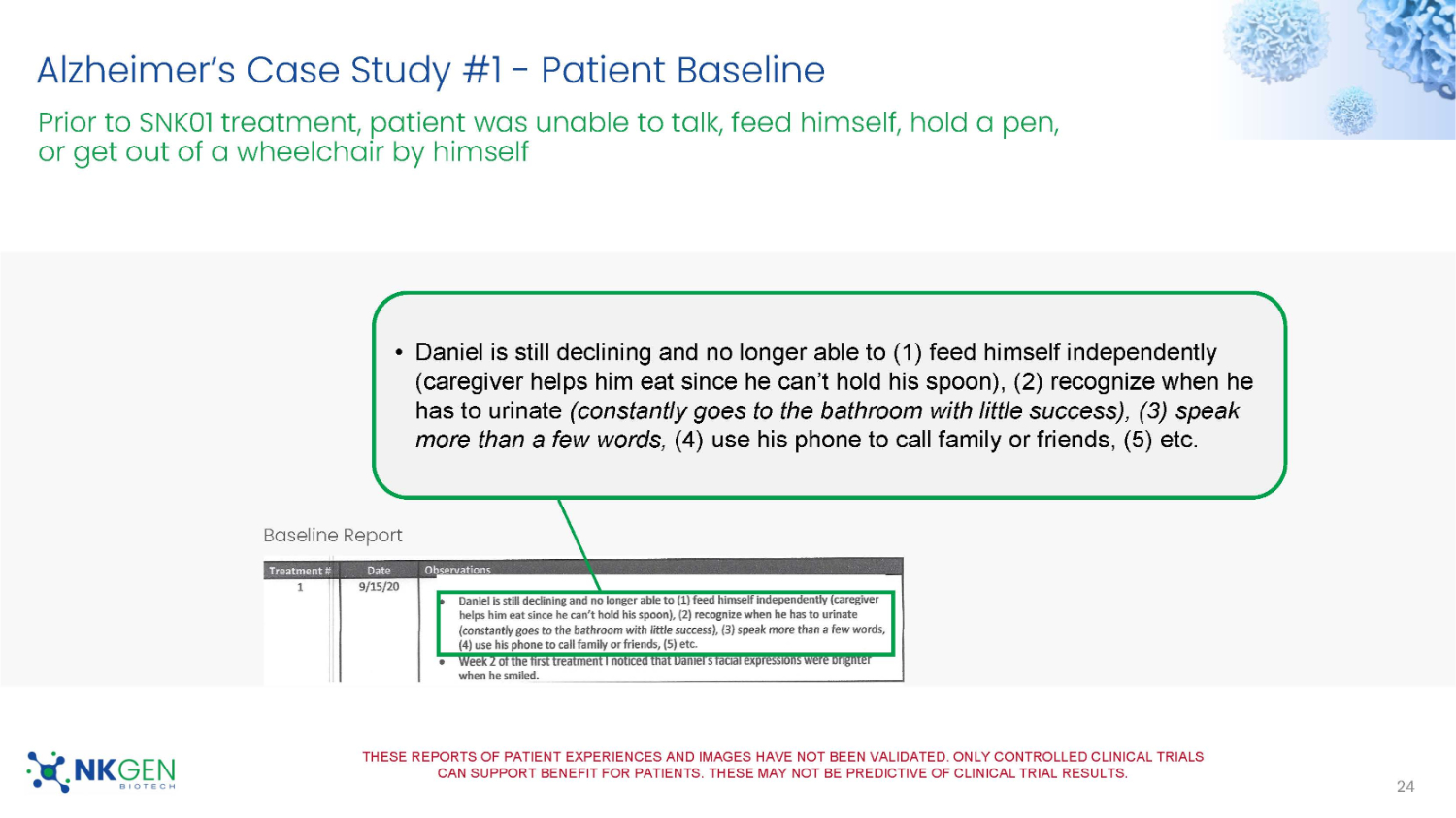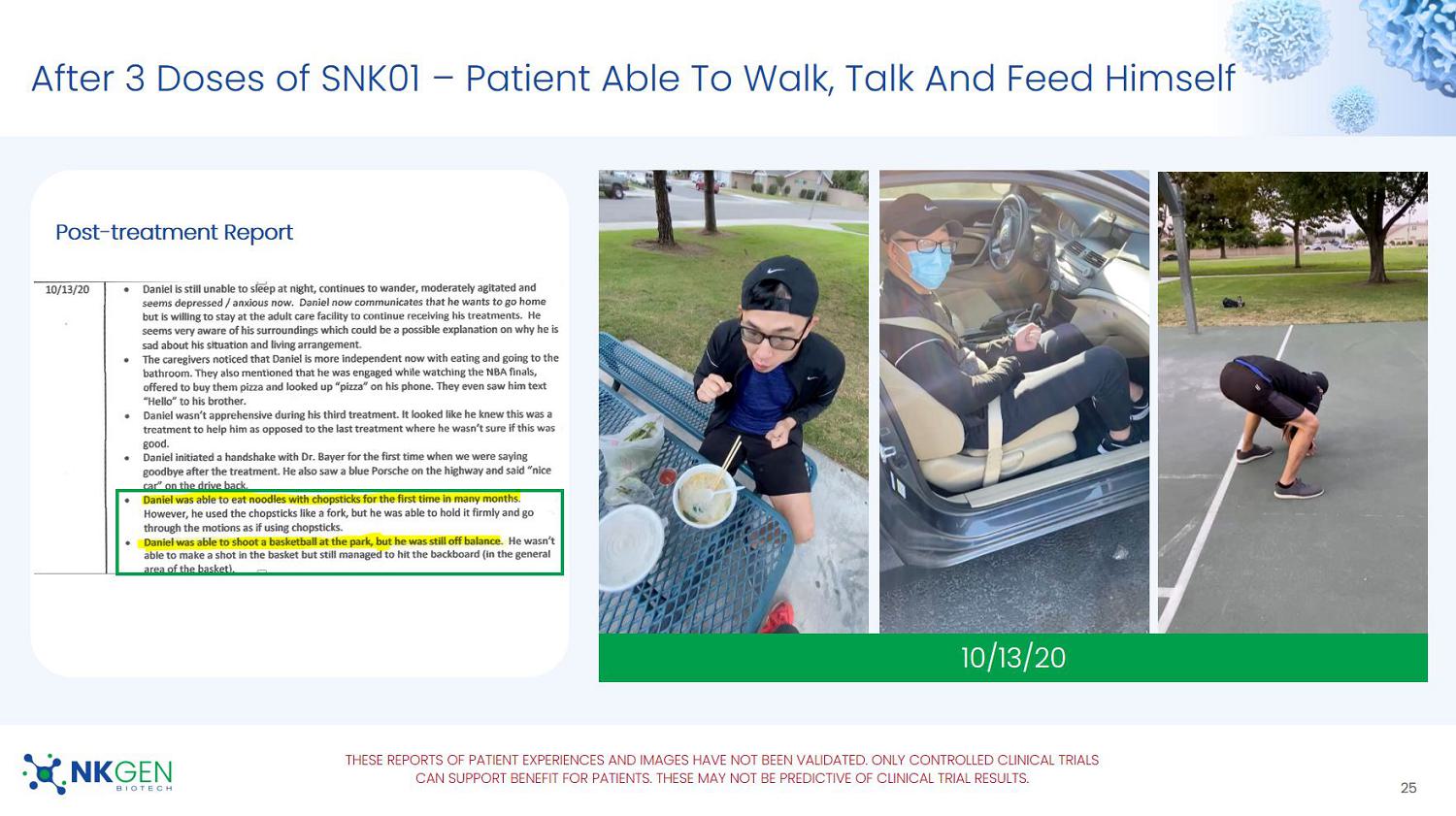 Alzheimer’s Case Study #1 - Patient Baseline 24 Prior to SNK01 treatment, patient was unable to talk, feed himself, hold a pen, or get out of a wheelchair by himself • Daniel is still declining and no longer able to (1) feed himself independently (caregiver helps him eat since he can’t hold his spoon), (2) recognize when he has to urinate (constantly goes to the bathroom with little success), (3) speak more than a few words, (4) use his phone to call family or friends, (5) etc. THESE REPORTS OF PATIENT EXPERIENCES AND IMAGES HAVE NOT BEEN VALIDATED. ONLY CONTROLLED CLINICAL TRIALS CAN SUPPORT BENEFIT FOR PATIENTS. THESE MAY NOT BE PREDICTIVE OF CLINICAL TRIAL RESULTS. Baseline Report