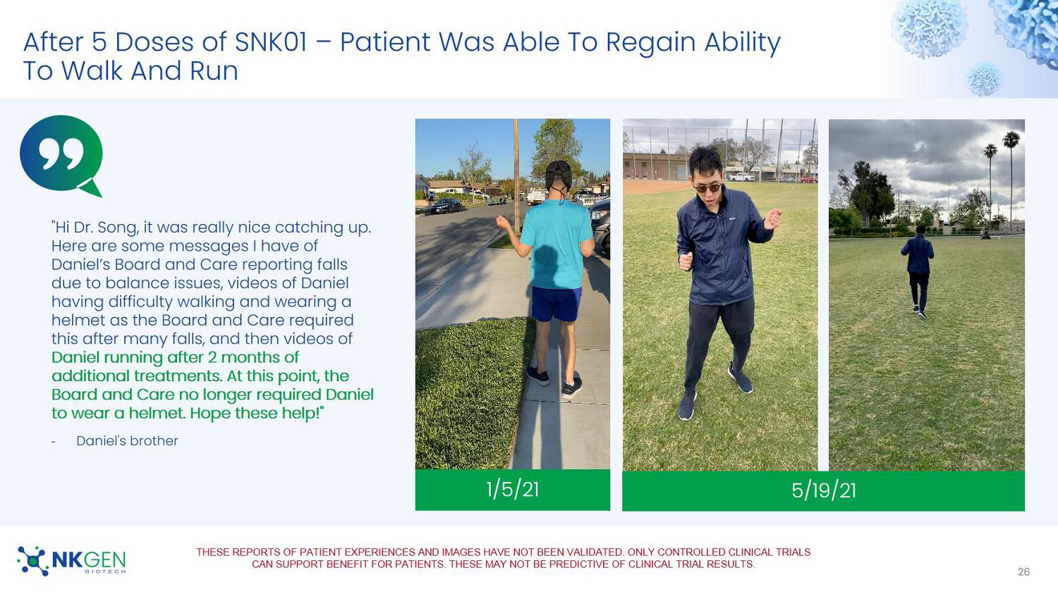 After 5 Doses of SNK01 – Patient Was Able To Regain Ability To Walk And Run 26 1/5/21 5/19/21 "Hi Dr. Song, it was really nice catching up. Here are some messages I have of Daniel’s Board and Care reporting falls due to balance issues, videos of Daniel having difficulty walking and wearing a helmet as the Board and Care required this after many falls, and then videos of Daniel running after 2 months of additional treatments. At this point, the Board and Care no longer required Daniel to wear a helmet. Hope these help!" - Daniel's brother THESE REPORTS OF PATIENT EXPERIENCES AND IMAGES HAVE NOT BEEN VALIDATED. ONLY CONTROLLED CLINICAL TRIALS CAN SUPPORT BENEFIT FOR PATIENTS. THESE MAY NOT BE PREDICTIVE OF CLINICAL TRIAL RESULTS.