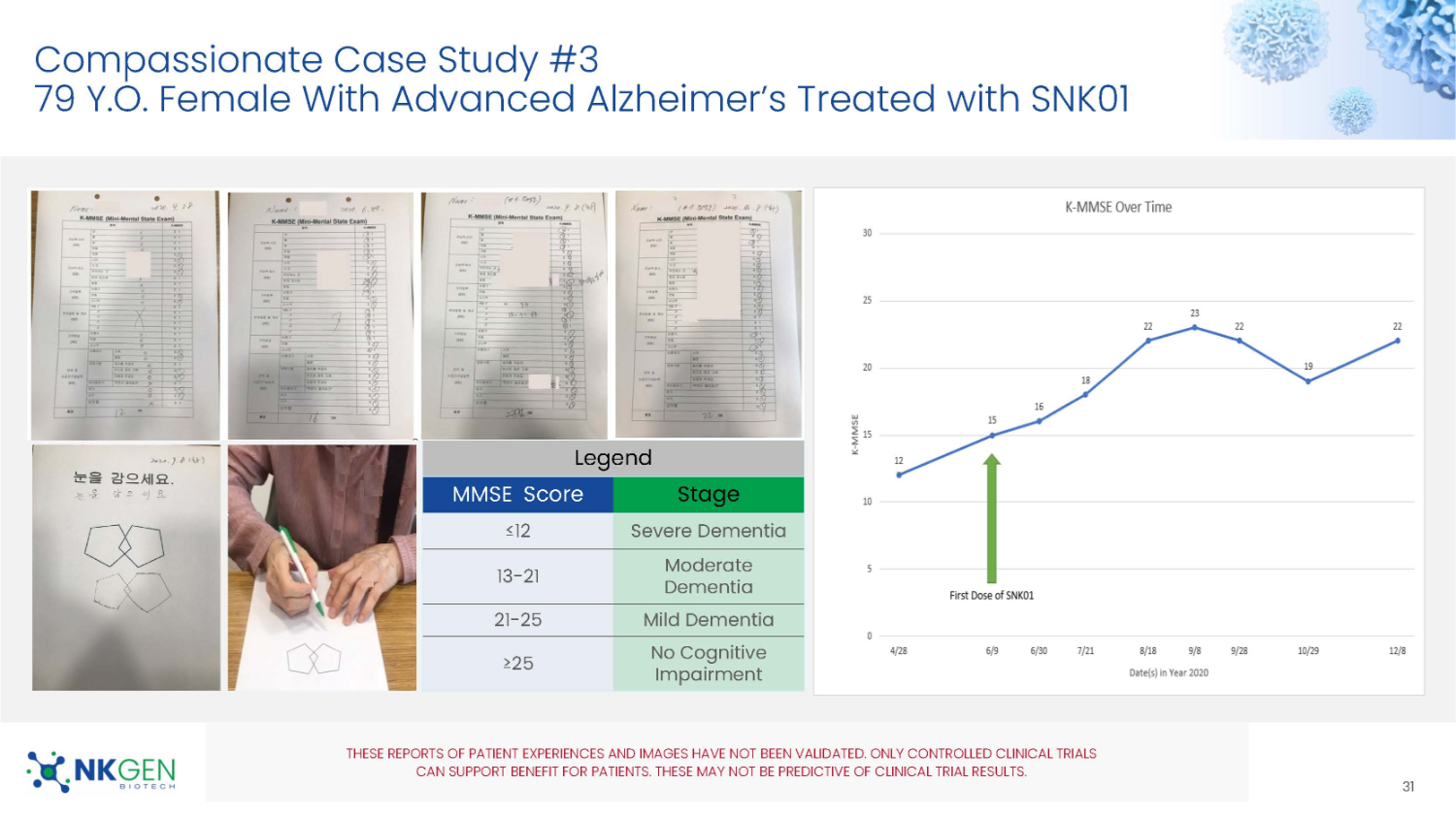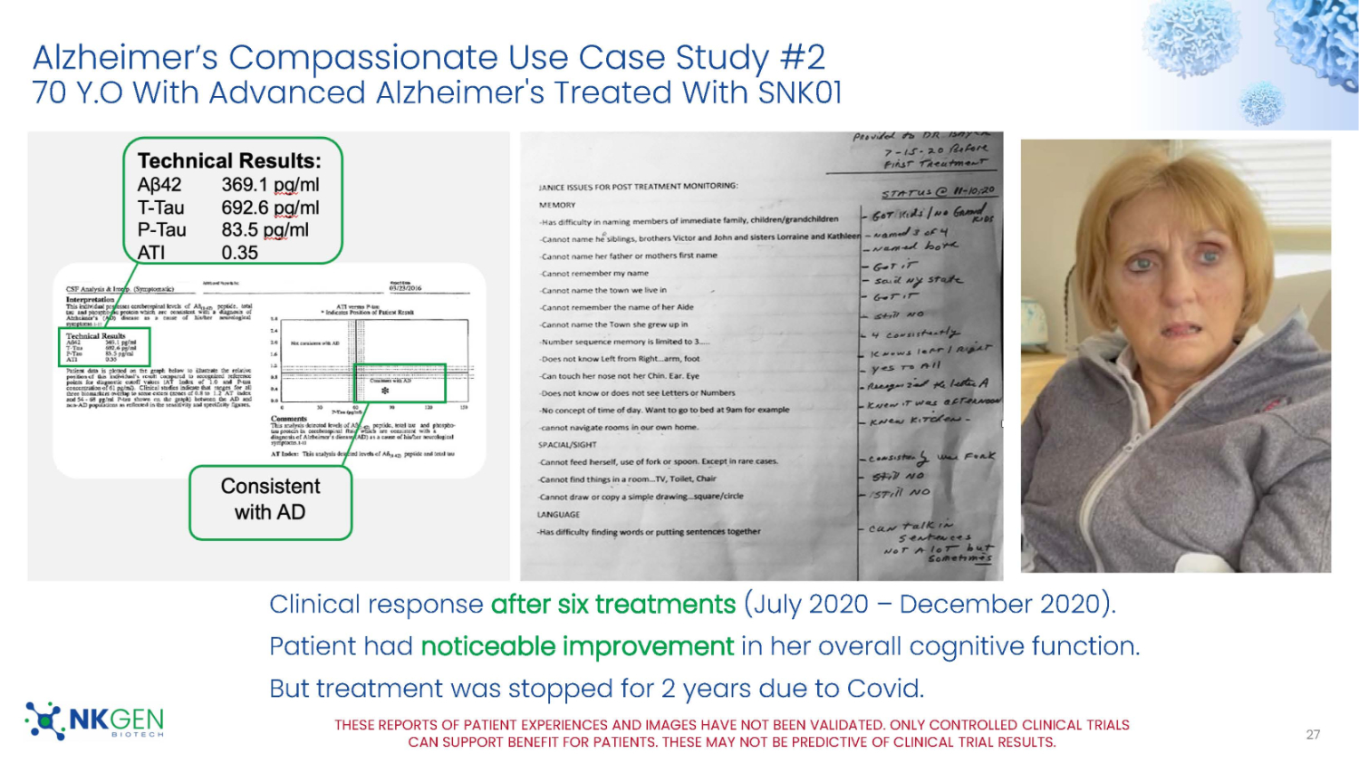 Alzheimer’s Compassionate Use Case Study #2 70 Y.O With Advanced Alzheimer's Treated With SNK01 Clinical response after six treatments (July 2020 – December 2020). Patient had noticeable improvement in her overall cognitive function. But treatment was stopped for 2 years due to Covid. 27 THESE REPORTS OF PATIENT EXPERIENCES AND IMAGES HAVE NOT BEEN VALIDATED. ONLY CONTROLLED CLINICAL TRIALS CAN SUPPORT BENEFIT FOR PATIENTS. THESE MAY NOT BE PREDICTIVE OF CLINICAL TRIAL RESULTS.