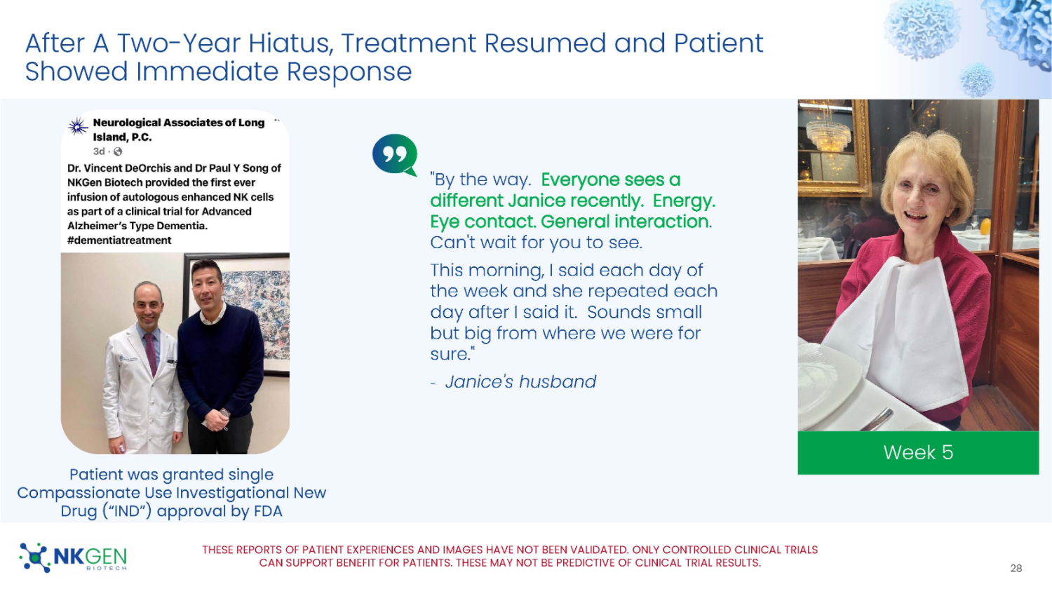 After A Two - Year Hiatus, Treatment Resumed and Patient Showed Immediate Response 28 Week 5 Patient was granted single Compassionate Use Investigational New Drug (“IND”) approval by FDA "By the way. Everyone sees a different Janice recently. Energy. Eye contact. General interaction . Can't wait for you to see. This morning, I said each day of the week and she repeated each day after I said it. Sounds small but big from where we were for sure." - Janice's husband THESE REPORTS OF PATIENT EXPERIENCES AND IMAGES HAVE NOT BEEN VALIDATED. ONLY CONTROLLED CLINICAL TRIALS CAN SUPPORT BENEFIT FOR PATIENTS. THESE MAY NOT BE PREDICTIVE OF CLINICAL TRIAL RESULTS.