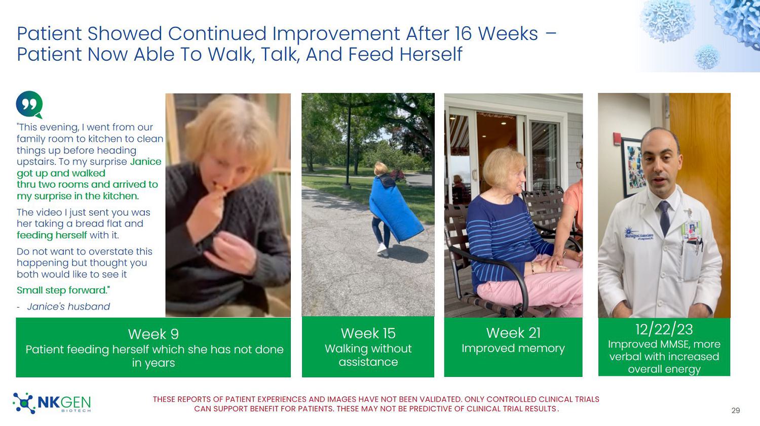 Patient Showed Continued Improvement After 16 Weeks – Patient Now Able To Walk, Talk, And Feed Herself Week 9 Patient feeding herself which she has not done in years Week 21 Improved memory "This evening, I went from our family room to kitchen to clean things up before heading upstairs. To my surprise Janice got up and walked thru two rooms and arrived to my surprise in the kitchen. The video I just sent you was her taking a bread flat and feeding herself with it. Do not want to overstate this happening but thought you both would like to see it Small step forward." - Janice's husband 29 Week 15 Walking without assistance THESE REPORTS OF PATIENT EXPERIENCES AND IMAGES HAVE NOT BEEN VALIDATED. ONLY CONTROLLED CLINICAL TRIALS CAN SUPPORT BENEFIT FOR PATIENTS. THESE MAY NOT BE PREDICTIVE OF CLINICAL TRIAL RESULTS . 12/22/23 Improved MMSE, more verbal with increased overall energy