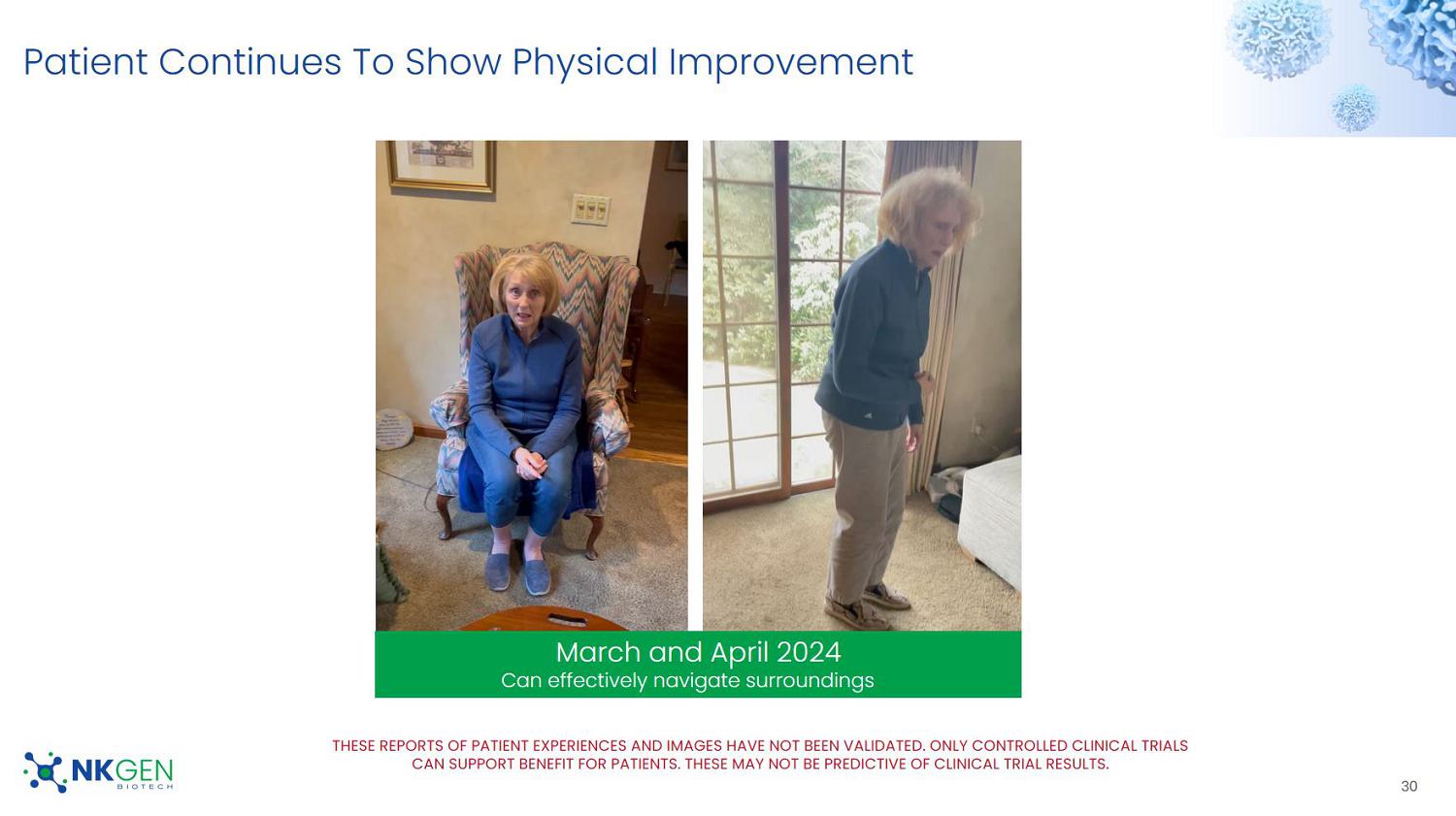 Patient Continues To Show Physical Improvement 30 THESE REPORTS OF PATIENT EXPERIENCES AND IMAGES HAVE NOT BEEN VALIDATED. ONLY CONTROLLED CLINICAL TRIALS CAN SUPPORT BENEFIT FOR PATIENTS. THESE MAY NOT BE PREDICTIVE OF CLINICAL TRIAL RESULTS. March and April 2024 Can effectively navigate surroundings
