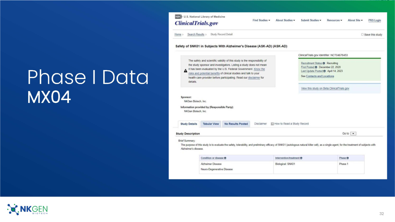 Compassionate Case Study #3 79 Y.O. Female With Advanced Alzheimer’s Treated with SNK01 Legend Stage MMSE Score Severe Dementia ≤12 Moderate Dementia 13 - 21 Mild Dementia 21 - 25 No Cognitive Impairment ≥25 THESE REPORTS OF PATIENT EXPERIENCES AND IMAGES HAVE NOT BEEN VALIDATED. ONLY CONTROLLED CLINICAL TRIALS CAN SUPPORT BENEFIT FOR PATIENTS. THESE MAY NOT BE PREDICTIVE OF CLINICAL TRIAL RESULTS. 31