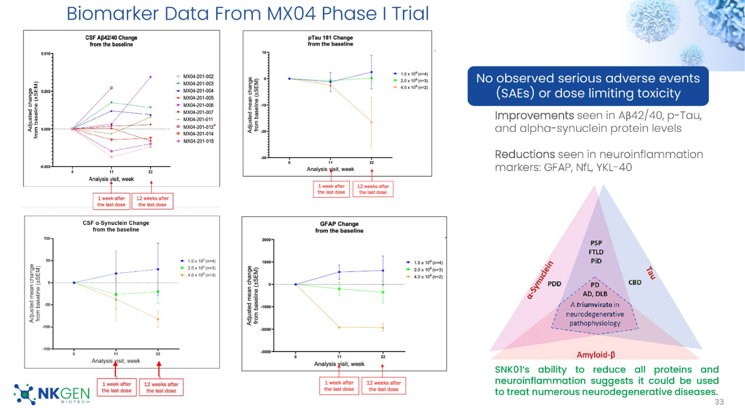 Biomarker Data From MX04 Phase I Trial No observed serious adverse events (SAEs) or dose limiting toxicity Improvements seen in A β 42/40, p - Tau, and alpha - synuclein protein levels Reductions seen in neuroinflammation markers: GFAP, NfL, YKL - 40 SNK 01 ’s ability to reduce all proteins and neuroinflammation suggests it could be used to treat numerous neurodegenerative diseases . 33