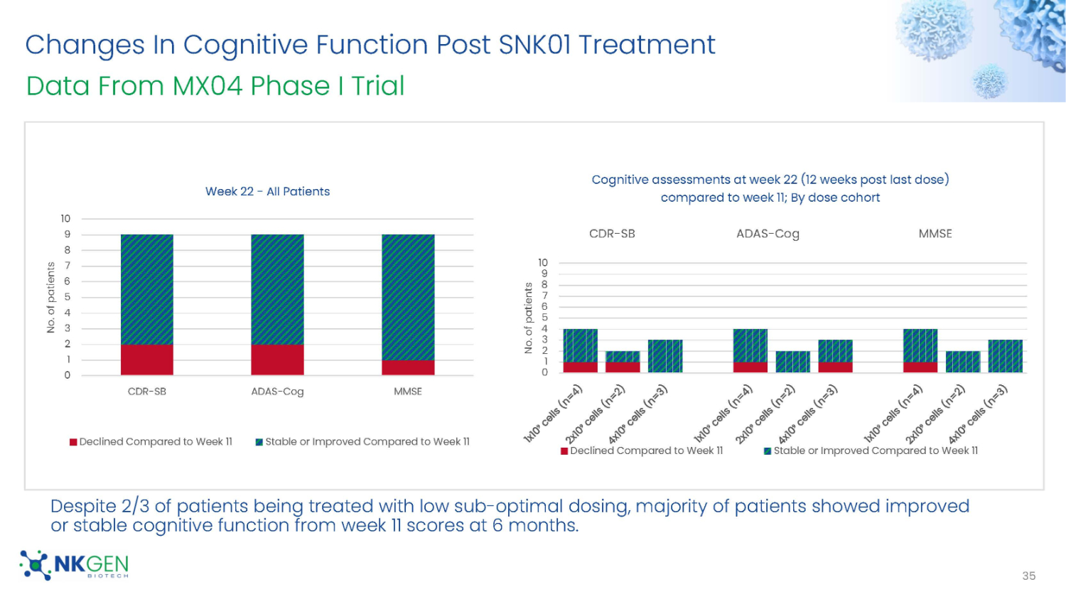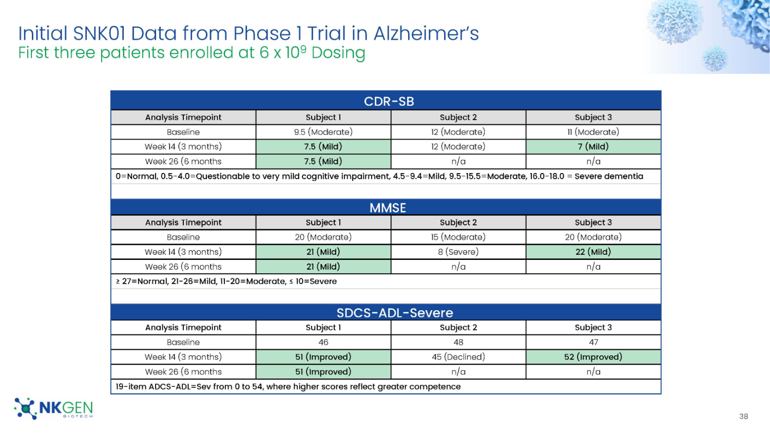 Initial SNK01 Data from Phase 1 Trial in Alzheimer’s First three patients enrolled at 6 x 10 9 Dosing Subject 3 ​ Subject 2 ​ Subject 1 ​ Analysis Timepoint ​ 11 (Moderate) ​ 12 (Moderate) ​ 9.5 (Moderate) ​ Baseline ​ 7 (Mild) ​ 12 (Moderate) ​ 7.5 (Mild) ​ Week 14 (3 months) ​ n/a ​ n/a ​ 7.5 (Mild) ​ Week 26 (6 months ​ 0=Normal, 0.5 - 4.0=Questionable to very mild cognitive impairment, 4.5 - 9.4=Mild, 9.5 - 15.5=Moderate, 16.0 - 18.0 = Severe dementia ​ ​ ​ ​ ​ ​ Subject 3 ​ Subject 2 ​ Subject 1 ​ Analysis Timepoint ​ 20 (Moderate) ​ 15 (Moderate) ​ 20 (Moderate) ​ Baseline ​ 22 (Mild) ​ 8 (Severe) ​ 21 (Mild) ​ Week 14 (3 months) ​ n/a ​ n/a ​ 21 (Mild) ​ Week 26 (6 months ​ ≥ 27=Normal, 21 - 26=Mild, 11 - 20=Moderate, ≤ 10=Severe ​ ​ ​ ​ ​ ​ Subject 3 ​ Subject 2 ​ Subject 1 ​ Analysis Timepoint ​ 47 ​ 48 ​ 46 ​ Baseline ​ 52 (Improved) ​ 45 (Declined) ​ 51 (Improved) ​ Week 14 (3 months) ​ n/a ​ n/a ​ 51 (Improved) ​ Week 26 (6 months ​ 19 - item ADCS - ADL= Sev from 0 to 54, where higher scores reflect greater competence ​ 38 CDR - SB MMSE SDCS - ADL - Severe