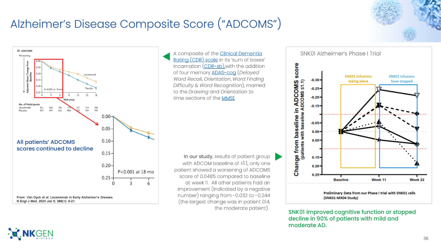 Alzheimer’s Disease Composite Score ( “ ADCOMS”) A composite of the Clinical Dementia Rating (CDR) scale in its ‘sum of boxes’ incarnation ( CDR - sb), with the addition of four memory ADAS - cog ( Delayed Word Recall , Orientation , Word Finding Difficulty & Word Recognition ), married to the Drawing and Orientation to time sections of the MMSE 36 In our study , results of patient group with ADCOM baseline of ≤1.1, only one patient showed a worsening of ADCOMS score of 0.0485 compared to baseline at week 11. All other patients had an improvement (indicated by a negative number) ranging from - 0.032 to - 0.244 (the largest change was in patient 014, the moderate patient). From: Van Dyck et al. Lecanemab in Early Alzheimer’s Disease. N Engl J Med. 2023 Jan 5; 388(1): 9 - 21. All patients’ ADCOMS scores continued to decline SNK01 Alzheimer’s Phase I Trial SNK01 improved cognitive function or stopped decline in 90% of patients with mild and moderate AD.