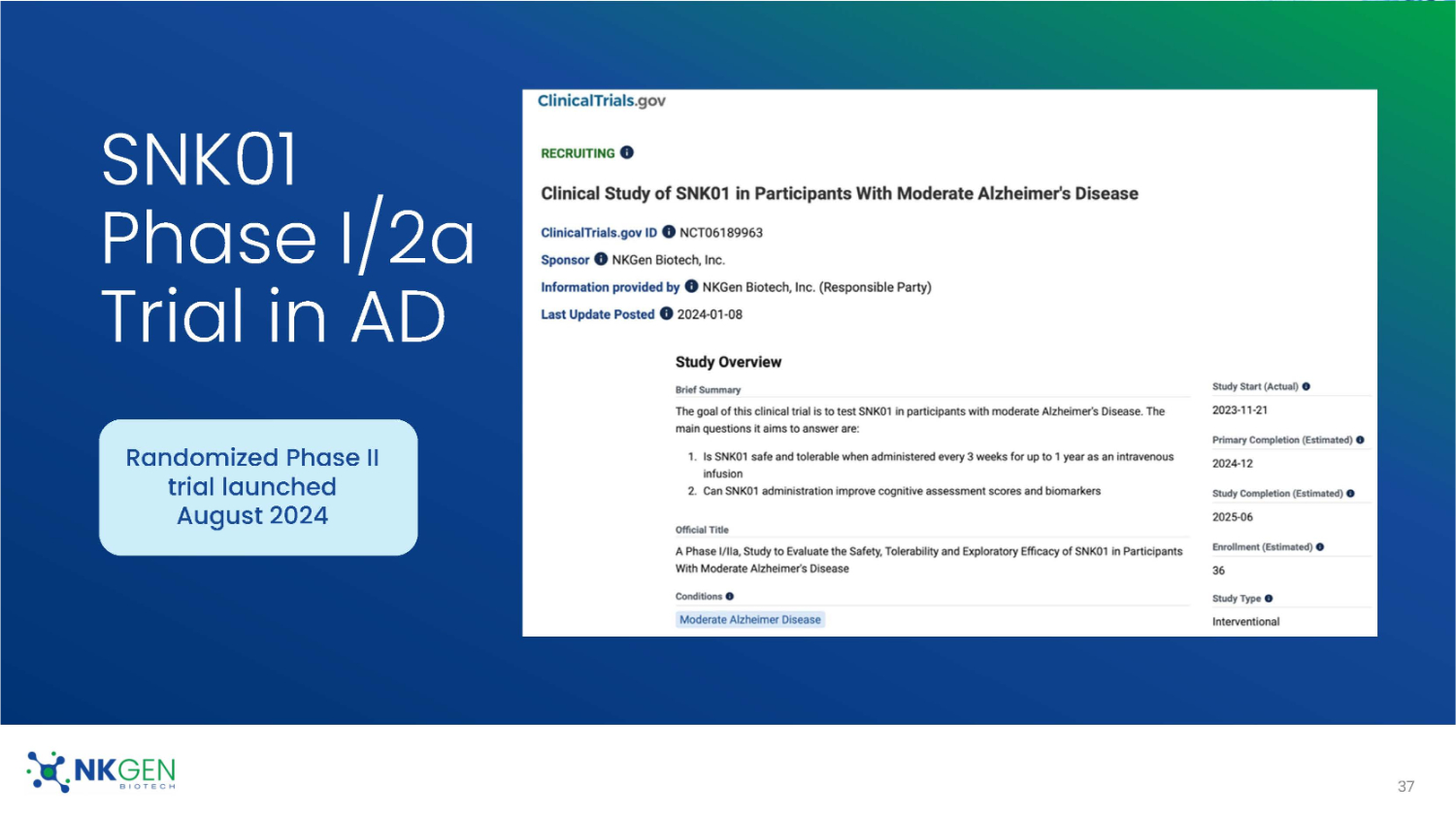 SNK01 Phase I/2a Trial in AD 37 Randomized Phase II trial launched August 2024