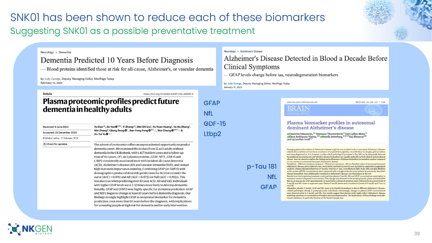 p - Tau 181 NfL GFAP GFAP NfL GDF - 15 Ltbp2 SNK01 has been shown to reduce each of these biomarkers Suggesting SNK01 as a possible preventative treatment 39