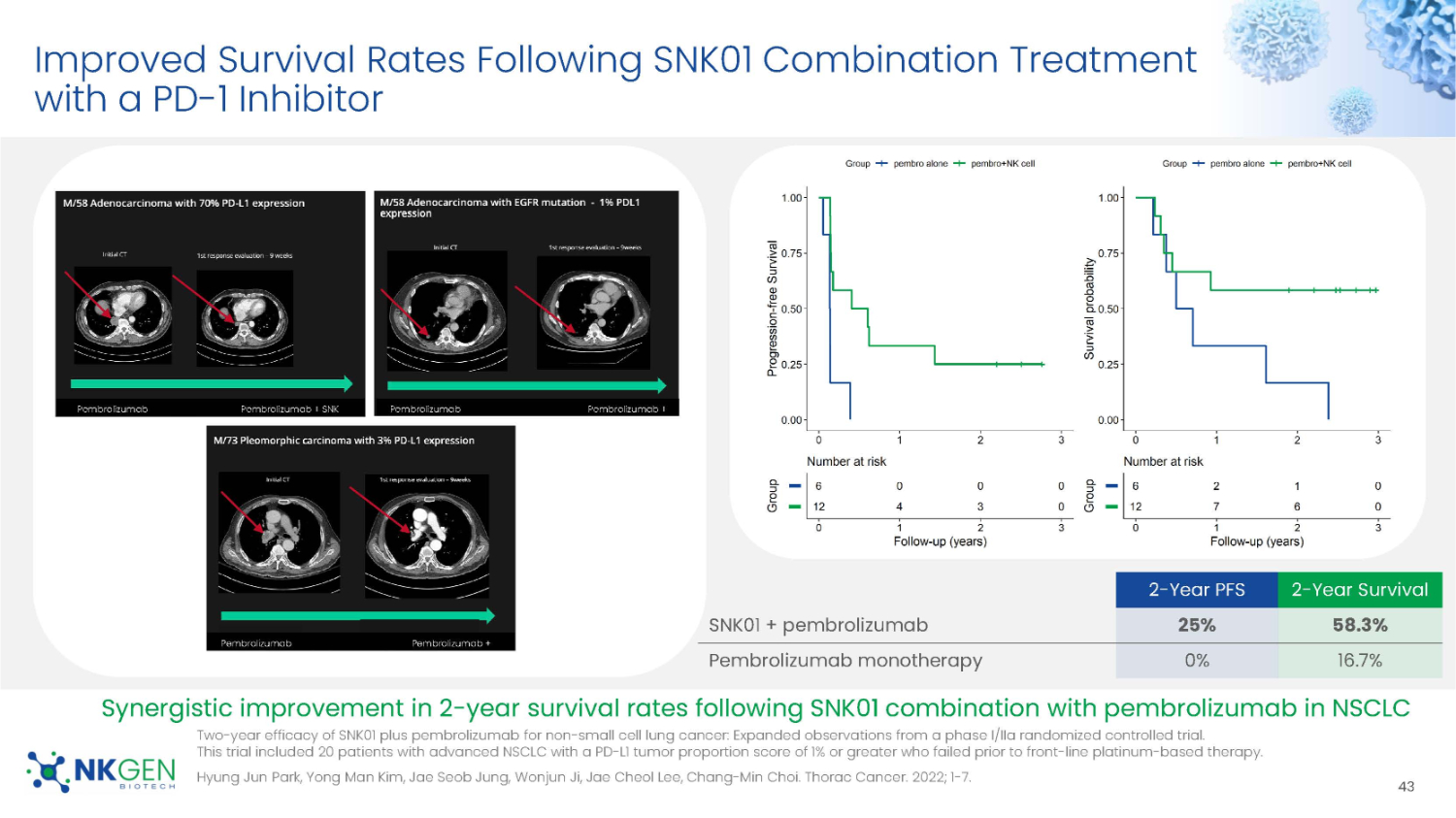 Improved Survival Rates Following SNK01 Combination Treatment with a PD - 1 Inhibitor 2 - Year Survival 2 - Year PFS 58.3% 25% SNK01 + pembrolizumab 16.7% 0% Pembrolizumab monotherapy Synergistic improvement in 2 - year survival rates following SNK01 combination with pembrolizumab in NSCLC Pembrolizumab Pembrolizumab + SNK #5 Pembrolizumab Pembrolizumab + SNK #5 Pembrolizumab Pembrolizumab + SNK #5 43 Two - year efficacy of SNK01 plus pembrolizumab for non - small cell lung cancer: Expanded observations from a phase I/ IIa randomized controlled trial. This trial included 20 patients with advanced NSCLC with a PD - L1 tumor proportion score of 1% or greater who failed prior to fro nt - line platinum - based therapy. Hyung Jun Park, Yong Man Kim, Jae Seob Jung, Wonjun Ji, Jae Cheol Lee, Chang - Min Choi. Thorac Cancer. 2022; 1 - 7.