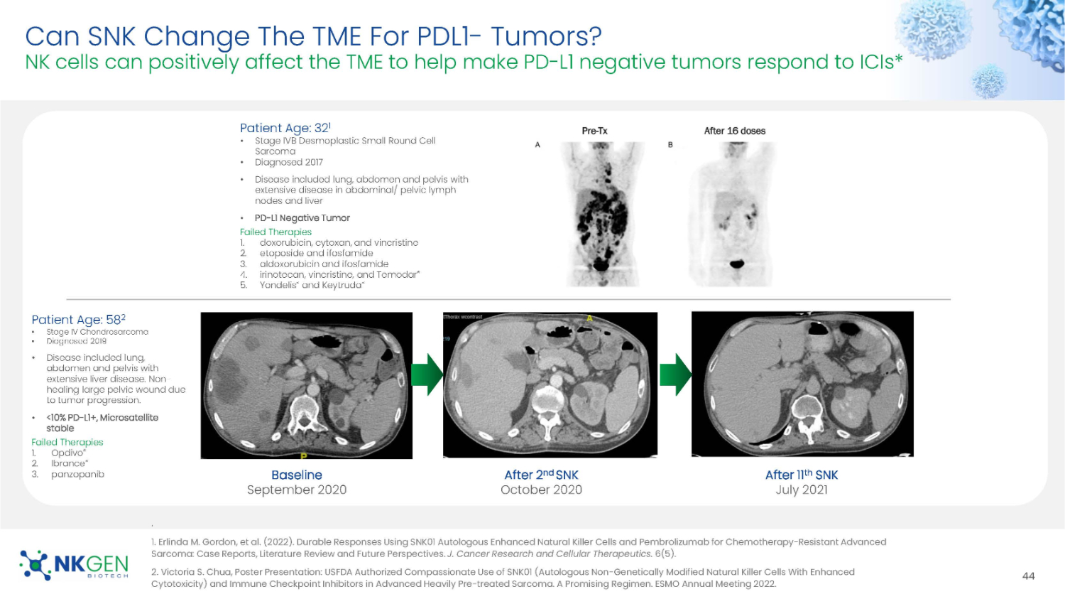 Can SNK Change The TME For PDL1 - Tumors? NK cells can positively affect the TME to help make PD - L1 negative tumors respond to ICIs* . 1 . Erlinda M. Gordon, et al. (2022). Durable Responses Using SNK01 Autologous Enhanced Natural Killer Cells and Pembrolizumab for Chemotherapy - Resistant Advanced Sarcoma: Case Reports, Literature Review and Future Perspectives. J. Cancer Research and Cellular Therapeutics. 6(5). 2 . Victoria S. Chua, Poster Presentation: USFDA Authorized Compassionate Use of SNK01 (Autologous Non - Genetically Modified Natura l Killer Cells With Enhanced Cytotoxicity) and Immune Checkpoint Inhibitors in Advanced Heavily Pre - treated Sarcoma. A Promising Regimen. ESMO Annual Meeting 2022. Baseline September 2020 After 2 nd SNK October 2020 After 11 th SNK July 2021 44 Patient Age: 58 2 • Stage IV Chondrosarcoma • Diagnosed 2019 • Disease included lung, abdomen and pelvis with extensive liver disease. Non - healing large pelvic wound due to tumor progression. • <10% PD - L1+, Microsatellite stable Failed Therapies 1. Opdivo ® 2. Ibrance ® 3. panzopanib Patient Age: 32 1 • Stage IVB Desmoplastic Small Round Cell Sarcoma • Diagnosed 2017 • Disease included lung, abdomen and pelvis with extensive disease in abdominal/ pelvic lymph nodes and liver • PD - L1 Negative Tumor Failed Therapies 1. doxorubicin, cytoxan, and vincristine 2. etoposide and ifosfamide 3. aldoxorubicin and ifosfamide 4. irinotecan, vincristine, and Temodar ® 5. Yondelis ® and Keytruda ®