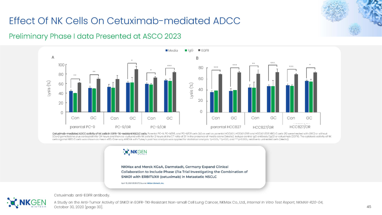 Effect Of NK Cells On Cetuximab - mediated ADCC Preliminary Phase I data Presented at ASCO 2023 Cetuximab: anti - EGFR antibody. A Study on the Anti - Tumor Activity of SNK01 in EGFR - TKI - Resistant Non - small Cell Lung Cancer, NKMax Co., Ltd., Internal In Vitro Test Report , NKMAX - R20 - 04 , October 30, 2020 [page 30]. 45 IgG Media EGFR Lysis (%) Lysis (%) parental PC - 9 PC - 9/GR PC - 9/OR parental HCC827 HCC827/GR HCC827/OR Con GC Con GC Con GC Con GC Con GC Con GC Cetuximab - mediated ADCC activity of NK cells in EGFR - TKI - resistant NSCLC cells. Parental PC - 9, PC - 9/GR, and PC - 9/OR cells (A) as well as parental HCC827, HCC827/GR and HCC827/OR NSCLC cells (B) were treated w ith (GC) or without (Con) gemcitabine plus carboplatin for 24 hours and then co - cultured with NK cells for 2 hours at the E:T ratio of 3:1 in the pr esence of media alone (Media), isotype control IgG antibody (IgG) or cetuximab (EGFR). The cytotoxic activity of NK cells against NSCLC cells was shown as mean ̃ SD. One - way ANOVA with Tukey’s post hoc analysis was applied for statistical analysis. *p<0.05, **p<0.01, and ***p<0.005, relati ve to untreated cells (Media). A B ** ** * * *** *** *** *** *** ** * 100 80 60 40 20 0 80 60 40 20 0
