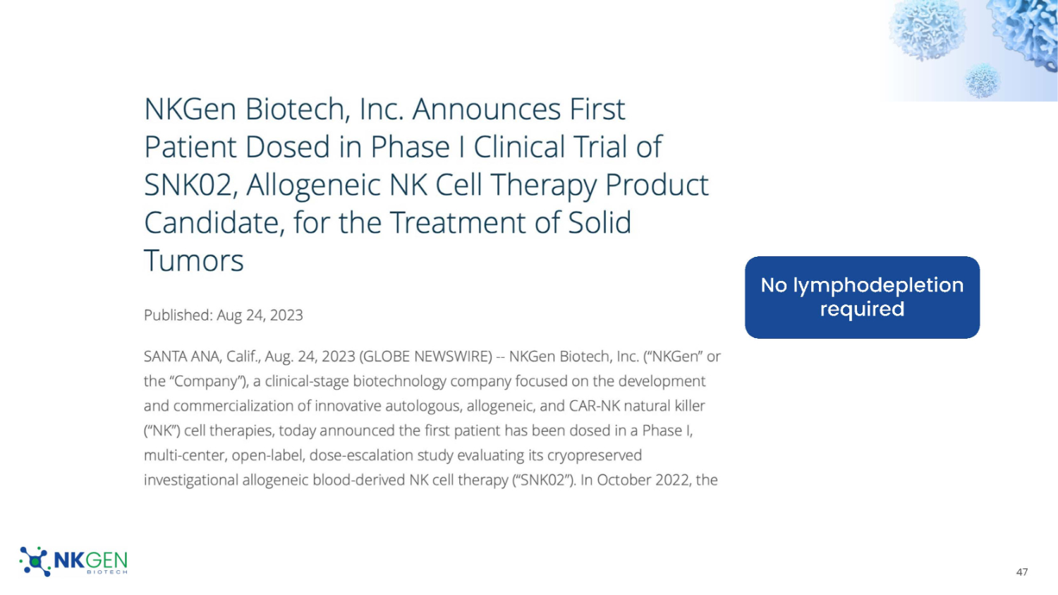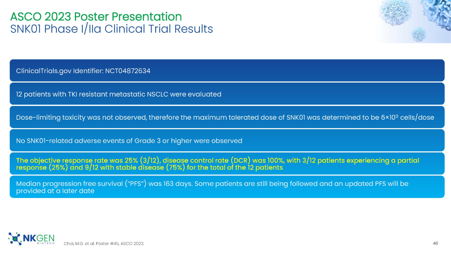ASCO 2023 Poster Presentation SNK01 Phase I/ IIa Clinical Trial Results ClinicalTrials.gov Identifier: NCT04872634 12 patients with TKI resistant metastatic NSCLC were evaluated Dose - limiting toxicity was not observed, therefore the maximum tolerated dose of SNK01 was determined to be 6 ̩ 10 9 cells/dose No SNK01 - related adverse events of Grade 3 or higher were observed The objective response rate was 25% (3/12), disease control rate (DCR) was 100%, with 3/12 patients experiencing a partial response (25%) and 9/12 with stable disease (75%) for the total of the 12 patients Median progression free survival (“PFS”) was 163 days. Some patients are still being followed and an updated PFS will be provided at a later date 46 Choi, M.G. et al. Poster #45, ASCO 2023.