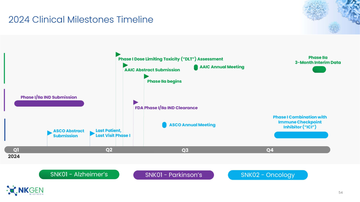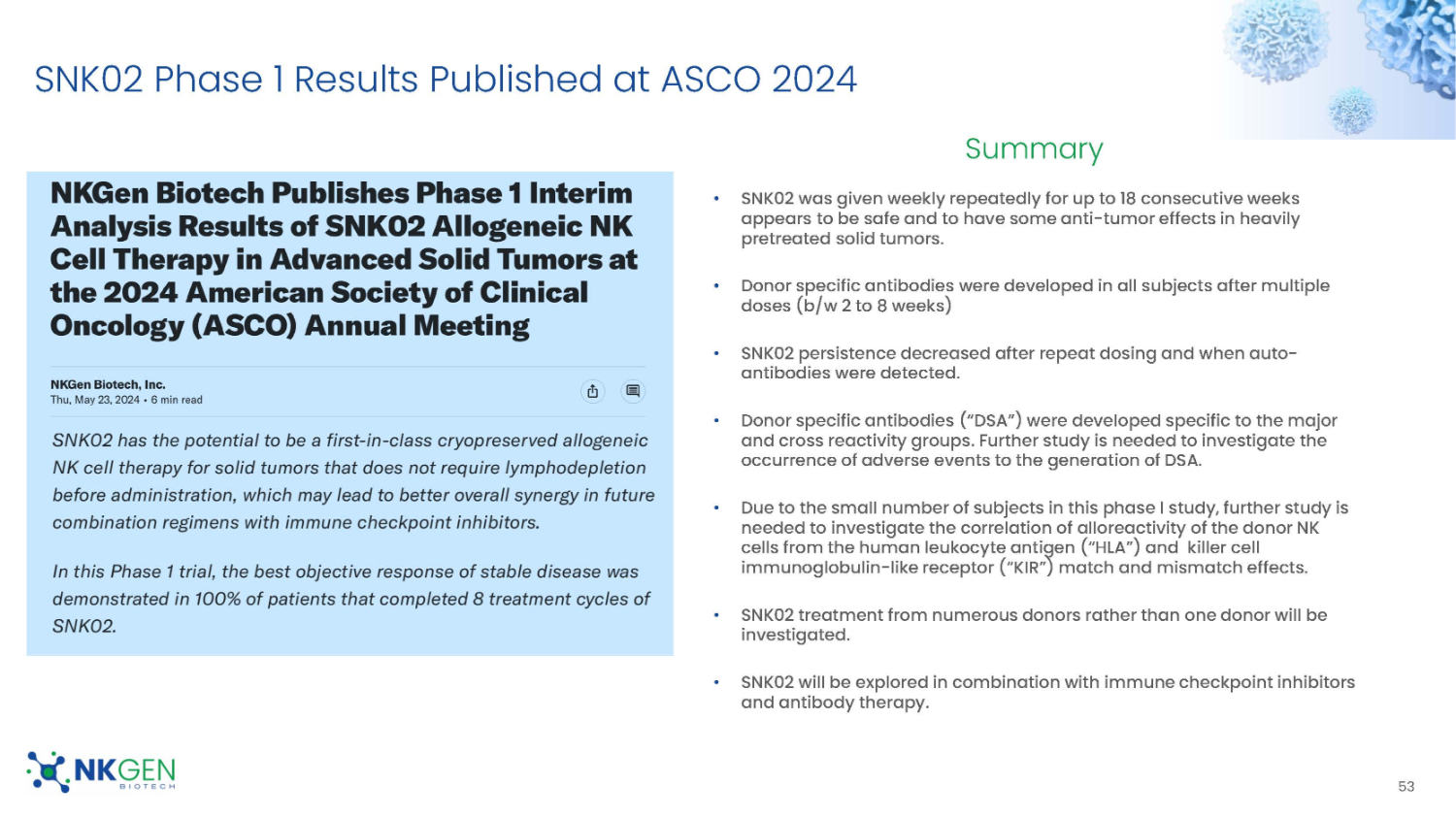 SNK02 Phase 1 Results Published at ASCO 2024 53 Summary • SNK02 was given weekly repeatedly for up to 18 consecutive weeks appears to be safe and to have some anti - tumor effects in heavily pretreated solid tumors. • Donor specific antibodies were developed in all subjects after multiple doses (b/w 2 to 8 weeks) • SNK02 persistence decreased after repeat dosing and when auto - antibodies were detected. • Donor specific antibodies (“DSA”) were developed specific to the major and cross reactivity groups. Further study is needed to investigate the occurrence of adverse events to the generation of DSA. • Due to the small number of subjects in this phase I study, further study is needed to investigate the correlation of alloreactivity of the donor NK cells from the human leukocyte antigen (“HLA”) and killer cell immunoglobulin - like receptor (“KIR”) match and mismatch effects. • SNK02 treatment from numerous donors rather than one donor will be investigated. • SNK02 will be explored in combination with immune checkpoint inhibitors and antibody therapy.