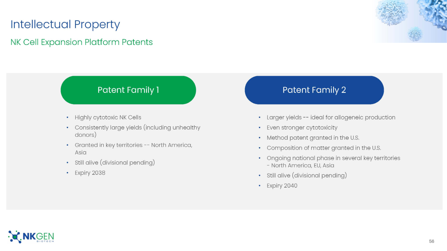 Intellectual Property NK Cell Expansion Platform Patents 56 • Highly cytotoxic NK Cells • Consistently large yields (including unhealthy donors) • Granted in key territories -- North America, Asia • Still alive (divisional pending) • Expiry 2038 • Larger yields -- ideal for allogeneic production • Even stronger cytotoxicity • Method patent granted in the U.S. • Composition of matter granted in the U.S. • Ongoing national phase in several key territories - North America, EU, Asia • Still alive (divisional pending) • Expiry 2040 Patent Family 1 Patent Family 2