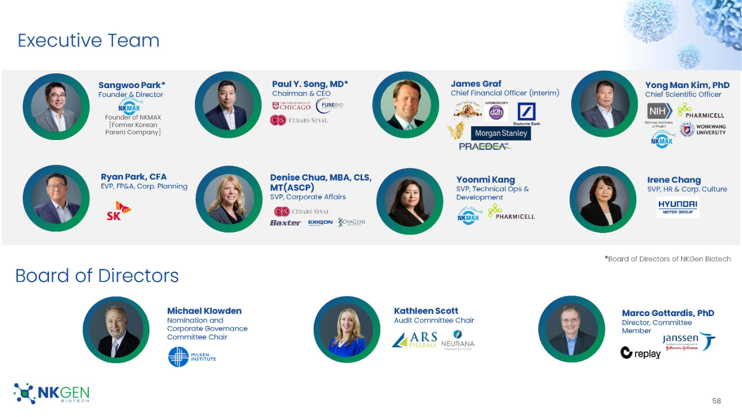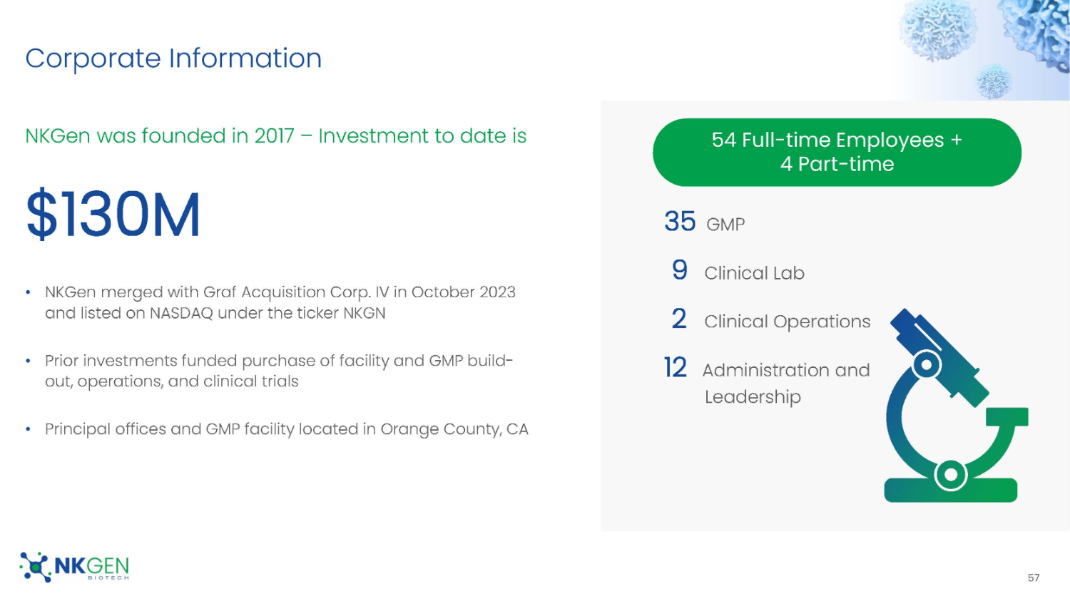 Corporate Information NKGen was founded in 2017 – Investment to date is $130M • NKGen merged with Graf Acquisition Corp. IV in October 2023 and listed on NASDAQ under the ticker NKGN • Prior investments funded purchase of facility and GMP build - out, operations, and clinical trials • Principal offices and GMP facility located in Orange County, CA 57 54 Full - time Employees + 4 Part - time 35 GMP 9 Clinical Lab 2 Clinical Operations 12 Administration and Leadership