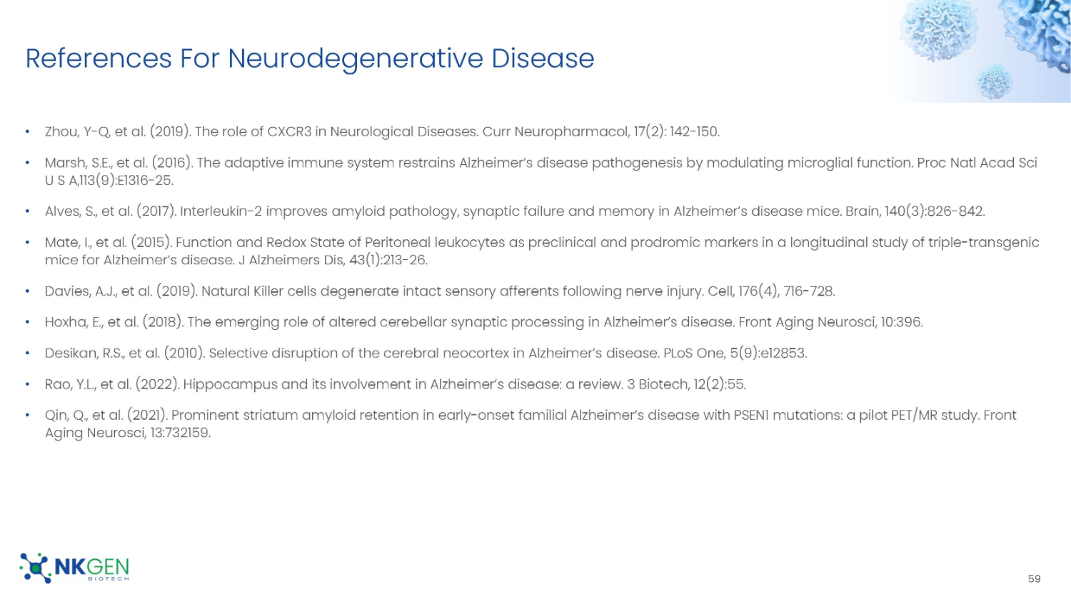 References For Neurodegenerative Disease • Zhou, Y - Q, et al. (2019). The role of CXCR3 in Neurological Diseases. Curr Neuropharmacol , 17(2): 142 - 150. • Marsh, S.E., et al. (2016). The adaptive immune system restrains Alzheimer’s disease pathogenesis by modulating microglial fu nct ion. Proc Natl Acad Sci U S A,113(9):E1316 - 25. • Alves, S., et al. (2017). Interleukin - 2 improves amyloid pathology, synaptic failure and memory in Alzheimer’s disease mice. Bra in, 140(3):826 - 842. • Mate, I., et al. (2015). Function and Redox State of Peritoneal leukocytes as preclinical and prodromic markers in a longitud ina l study of triple - transgenic mice for Alzheimer’s disease. J Alzheimers Dis, 43(1):213 - 26. • Davies, A.J., et al. (2019). Natural Killer cells degenerate intact sensory afferents following nerve injury. Cell, 176(4), 7 16 - 728. • Hoxha, E., et al. (2018). The emerging role of altered cerebellar synaptic processing in Alzheimer’s disease. Front Aging Neurosci , 10:396. • Desikan , R.S., et al. (2010). Selective disruption of the cerebral neocortex in Alzheimer’s disease. PLoS One, 5(9):e12853. • Rao, Y.L., et al. (2022). Hippocampus and its involvement in Alzheimer’s disease: a review. 3 Biotech, 12(2):55. • Qin, Q., et al. (2021). Prominent striatum amyloid retention in early - onset familial Alzheimer’s disease with PSEN1 mutations: a pilot PET/MR study. Front Aging Neurosci , 13:732159. 59