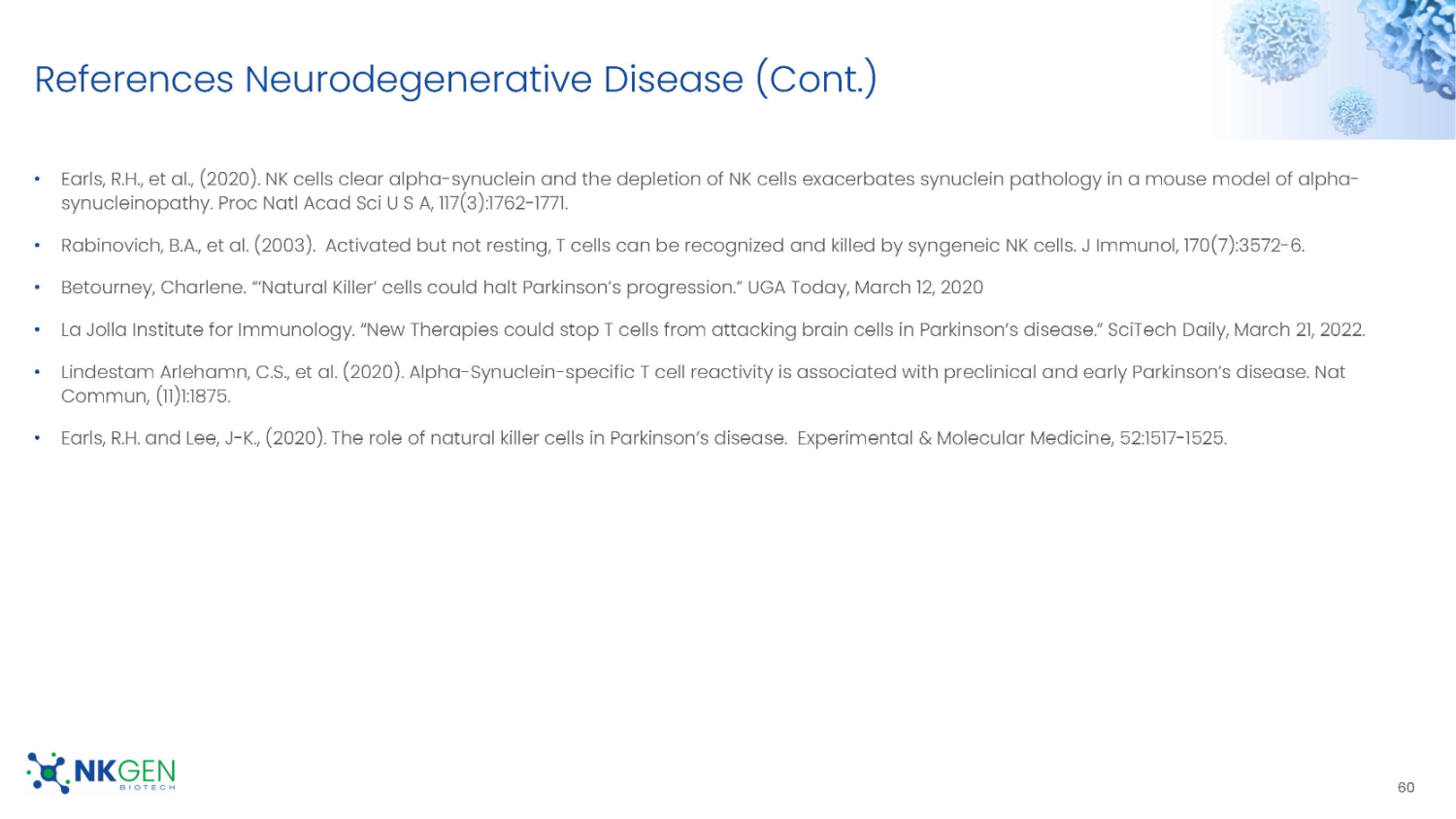References Neurodegenerative Disease (Cont.) • Earls, R.H., et al., (2020). NK cells clear alpha - synuclein and the depletion of NK cells exacerbates synuclein pathology in a m ouse model of alpha - synucleinopathy. Proc Natl Acad Sci U S A, 117(3):1762 - 1771. • Rabinovich , B.A., et al. (2003). Activated but not resting, T cells can be recognized and killed by syngeneic NK cells. J Immunol, 170 (7) :3572 - 6. • Betourney , Charlene. “‘Natural Killer’ cells could halt Parkinson’s progression.” UGA Today, March 12, 2020 • La Jolla Institute for Immunology. “New Therapies could stop T cells from attacking brain cells in Parkinson’s disease.” SciT ech Daily, March 21, 2022. • Lindestam Arlehamn , C.S., et al. (2020). Alpha - Synuclein - specific T cell reactivity is associated with preclinical and early Parkinson’s disease. Nat Commun , (11)1:1875. • Earls, R.H. and Lee, J - K., (2020). The role of natural killer cells in Parkinson’s disease. Experimental & Molecular Medicine, 52:1517 - 1525. 60