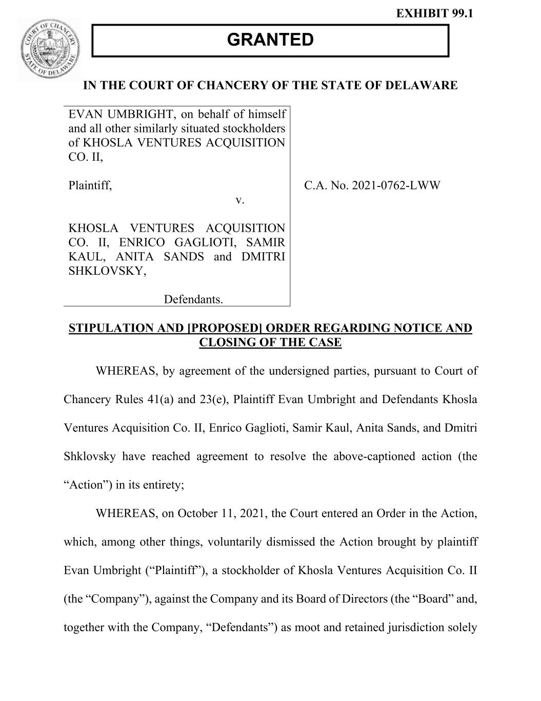 IN THE COURT OF CHANCERY OF THE STATE OF DELAWARE EVAN UMBRIGHT, on behalf of himself and all other similarly situated stockholders of KHOSLA VENTURES ACQUISITION CO. II, Plaintiff, v. KHOSLA VENTURES ACQUISITION CO. II, ENRICO GAGLIOTI, SAMIR KAUL, ANITA SANDS and DMITRI SHKLOVSKY, Defendants. C.A. No. 2021-0762-LWW STIPULATION AND [PROPOSED] ORDER REGARDING NOTICE AND CLOSING OF THE CASE WHEREAS, by agreement of the undersigned parties, pursuant to Court of Chancery Rules 41(a) and 23(e), Plaintiff Evan Umbright and Defendants Khosla Ventures Acquisition Co. II, Enrico Gaglioti, Samir Kaul, Anita Sands, and Dmitri Shklovsky have reached agreement to resolve the above-captioned action (the “Action”) in its entirety; WHEREAS, on October 11, 2021, the Court entered an Order in the Action, which, among other things, voluntarily dismissed the Action brought by plaintiff Evan Umbright (“Plaintiff”), a stockholder of Khosla Ventures Acquisition Co. II (the “Company”), against the Company and its Board of Directors (the “Board” and, together with the Company, “Defendants”) as moot and retained jurisdiction solely GRANTED EXHIBIT 99.1